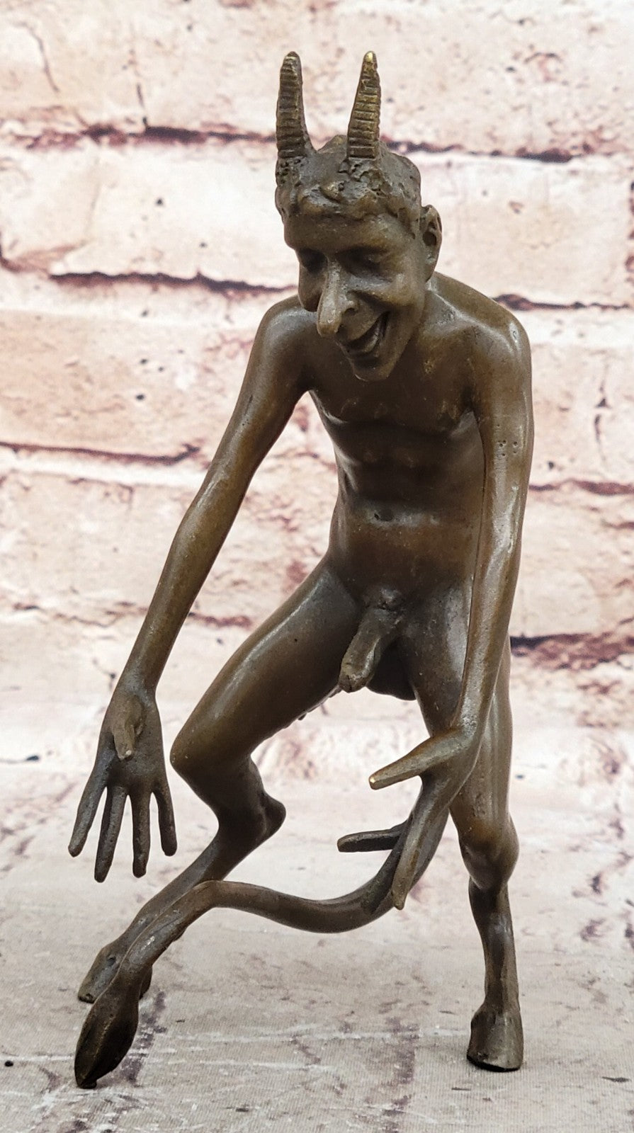 The satyr's devilish face and horns add to the overall frightening ambiance of the sculpture, highlighting the mythical and mysterious nature of this creature. The artist, Milo, has crafted this sculpture from solid bronze, utilizing the traditional "Lost Wax Method" to ensure fine detail and quality. The sculpture is finished with a brown patina, adding a touch of antiquity and preserving its unique characteristics.