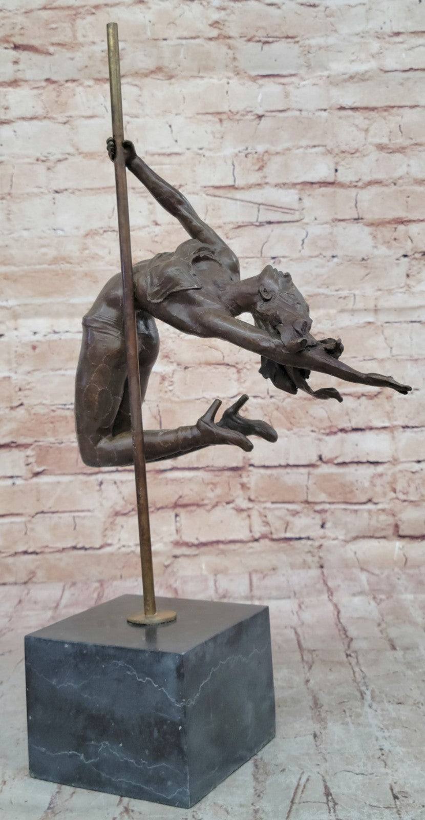 This captivating bronze sculpture depicts a talented gymnast in a stunning display of agility and flexibility. Balancing effortlessly on a pole, the gymnast curves her muscular legs backward, resting them gracefully on her shoulders. Her poised and fluid movement captures the essence of her performance, evoking admiration from those who witness her skill. The semi-nude figure highlights her athletic body, emphasizing the strength and precision required for such a remarkable pose.