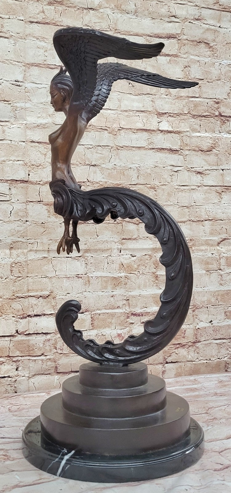 Perched gracefully atop a solid black marble base, the sculpture's elegant tail extends in a sweeping 3/4 circle, seamlessly merging with the female form under a delicate skirt-like embellishment. Delicately crafted swan feet dangle from the bottom of her body, while her lean and curvaceous upper torso captivates with its refined detailing and intricate contours. The exquisitely detailed facial features mirror the elegance of a traditional Thai woman, with sleek, alluring eyes and a strikingly detailed head adorned with three whimsical feathers that gracefully extend upward from her hairline. Completing the captivating ensemble, the sculpture boasts two grand, meticulously detailed wings, each feather meticulously rendered to create a stunning visual cascade down the expanse of the wings. With its rich antique patina finish and intricate craftsmanship, this sculpture is a true testament to the artistry of its creator, signed by the renowned artist Marius.