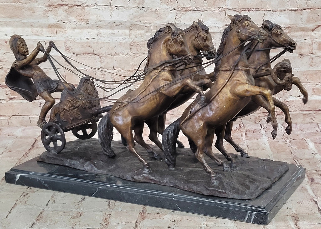 The front of the chariot features a finely detailed eagle’s head, a proud emblem of the Roman Empire symbolizing victory and divine power. The sculptor’s attention to detail brings life to the scene, capturing both the physical power of the horses and the refined craftsmanship of ancient artistry. This dynamic depiction reflects not only the excitement of the ancient games but also the enduring human admiration for courage, skill, and triumph.
