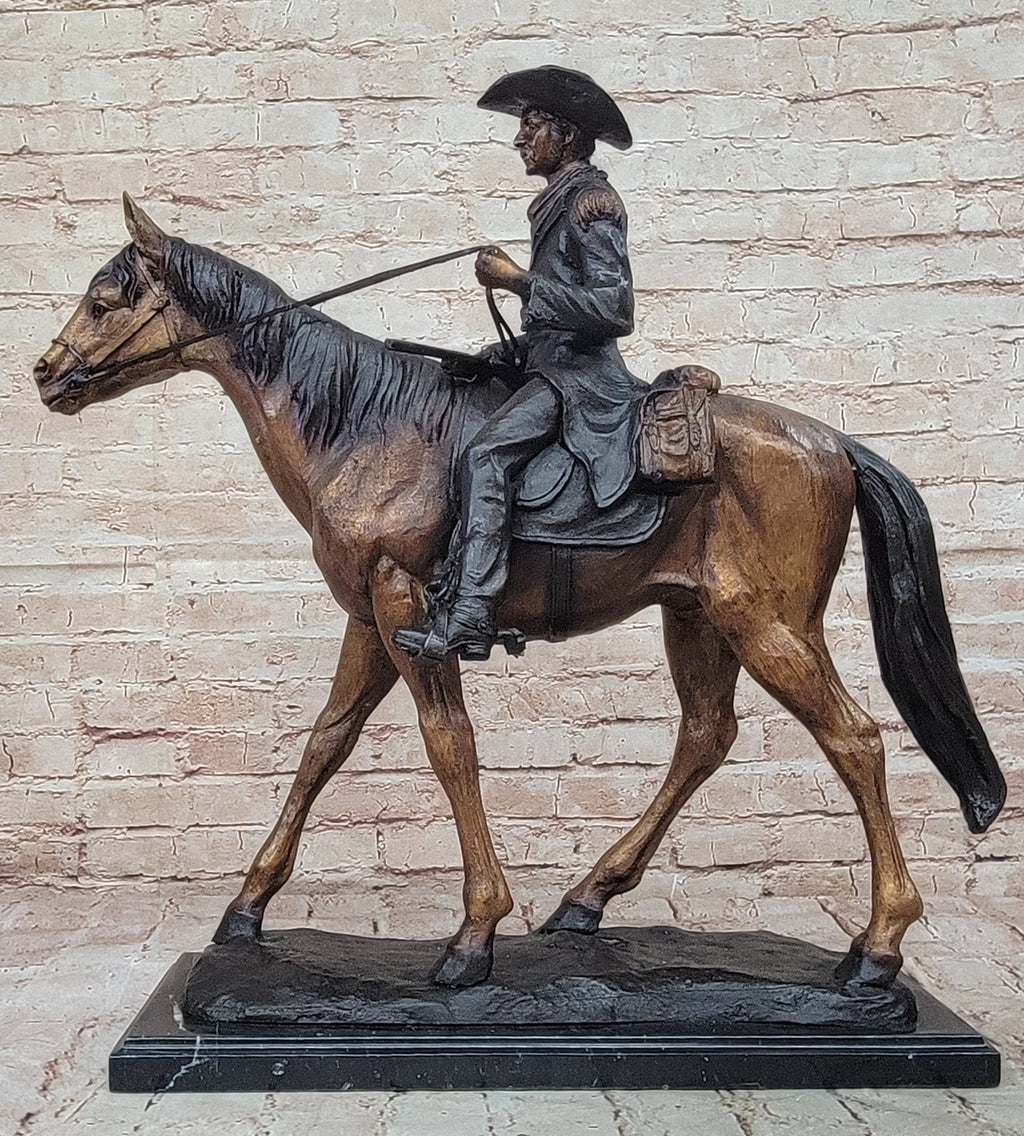 Handmade using the lost wax method, this sculpture ensures exceptional detail and quality. The two-tone brown patina finish highlights the intricate textures and nuances, giving the piece a lifelike presence. The cowboy's weathered clothes, the horse's muscular form, and the overall composition are rendered with remarkable fidelity, making this sculpture a striking representation of Western art.