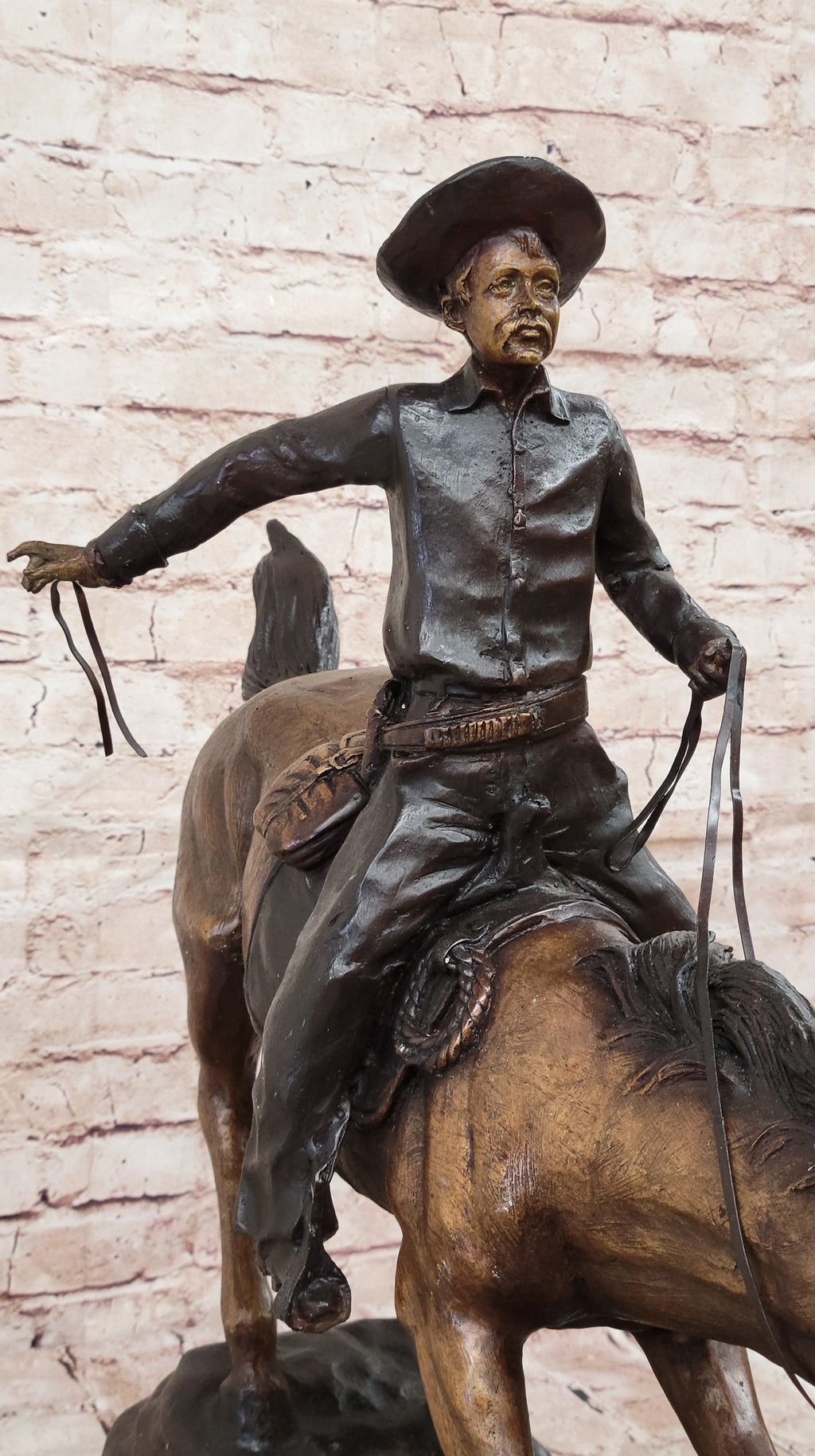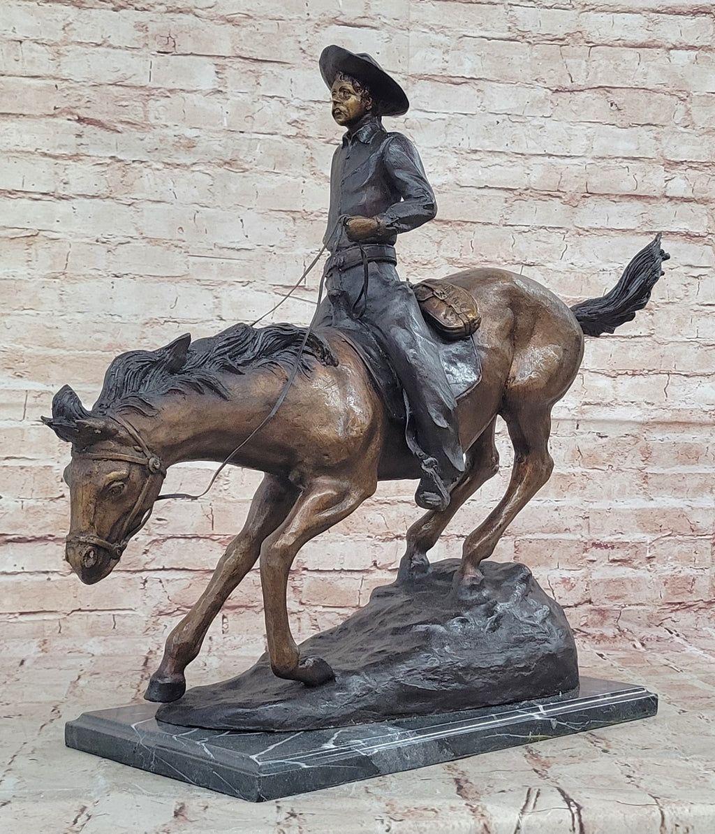 Mounted on a sleek black marble base, this sculpture stands as a testament to both artistic skill and historical reverence. The two-tone brown patina finish adds depth and richness to the piece, enhancing its visual appeal. Whether displayed in a gallery, a Western-themed room, or as a centerpiece in your home, this sculpture is a remarkable representation of the American frontier and the cowboy's enduring legacy.