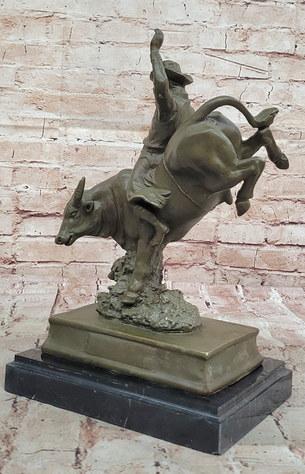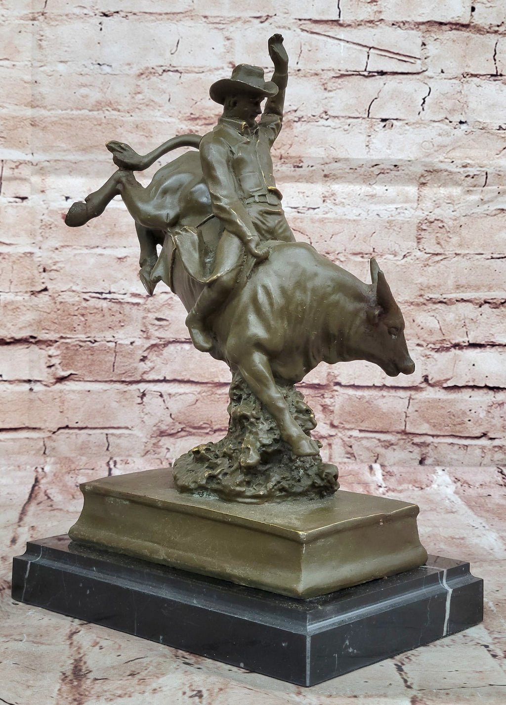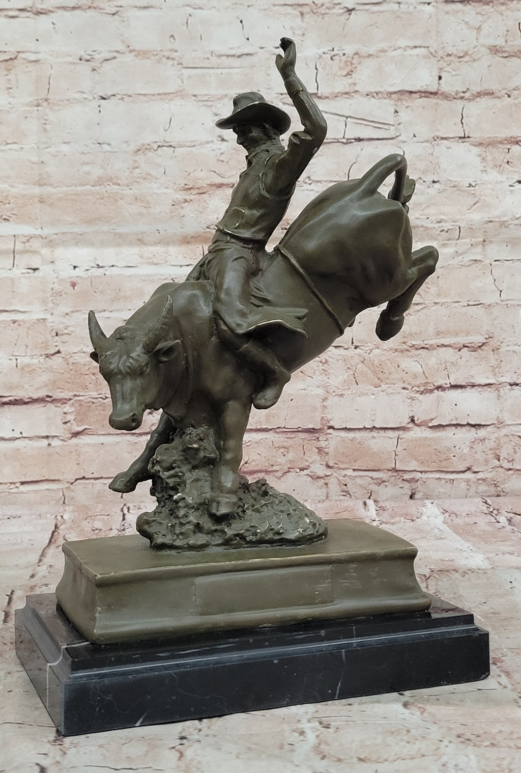 Mounted on a sleek black marble base, this bronze piece makes a bold statement whether displayed in a home, office, or western-themed space. It's an excellent addition for collectors of Remington-style art, lovers of Western Americana, or anyone who appreciates the grit and grace of rodeo life.
