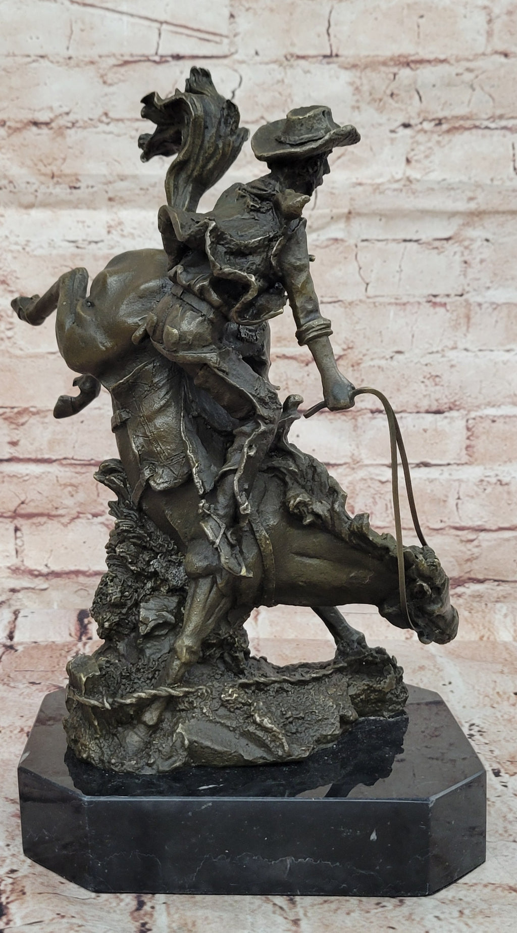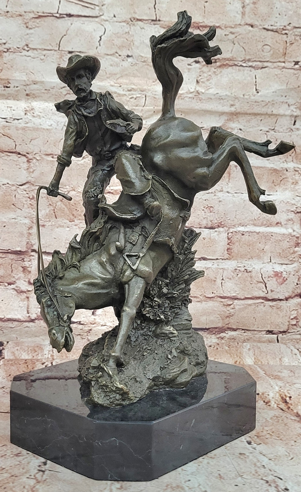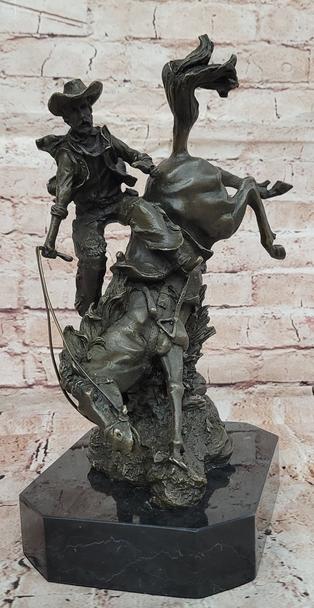 Crafted with meticulous care from 100% bronze, this masterpiece exemplifies the highest standards of artistry. Each stroke and contour was carefully shaped by hand, employing the revered "Lost Wax Method." The result is a stunning two-toned brown patina, which lends depth and character to the sculpture. Mounted upon a sleek black marble base, it stands as a test