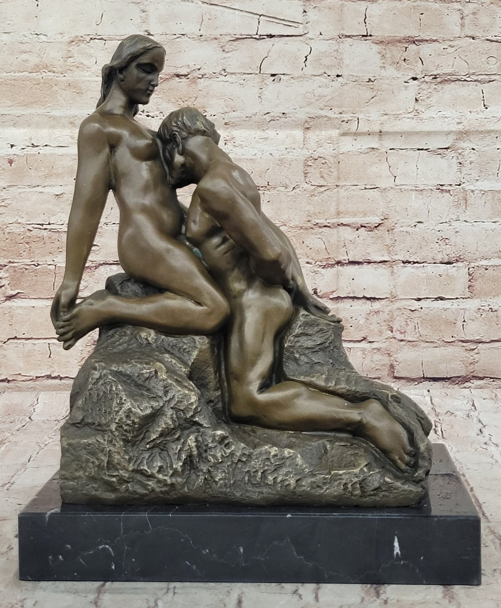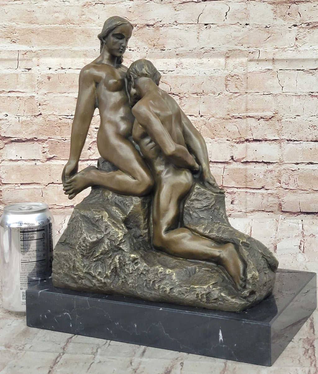 Crafted with meticulous precision using the antiquated lost-wax casting technique, the sculpture bears the rich patina finish that enhances its allure. Resting gracefully on a black marble base, adorned with Auguste Rodin's signature, this heart-piercing work of art invites contemplation and reflection on the multifaceted meanings it holds. A timeless representation of love and devotion, the "Eternal Idol" stands as a testament to Rodin's mastery and the enduring power of sculpted art.