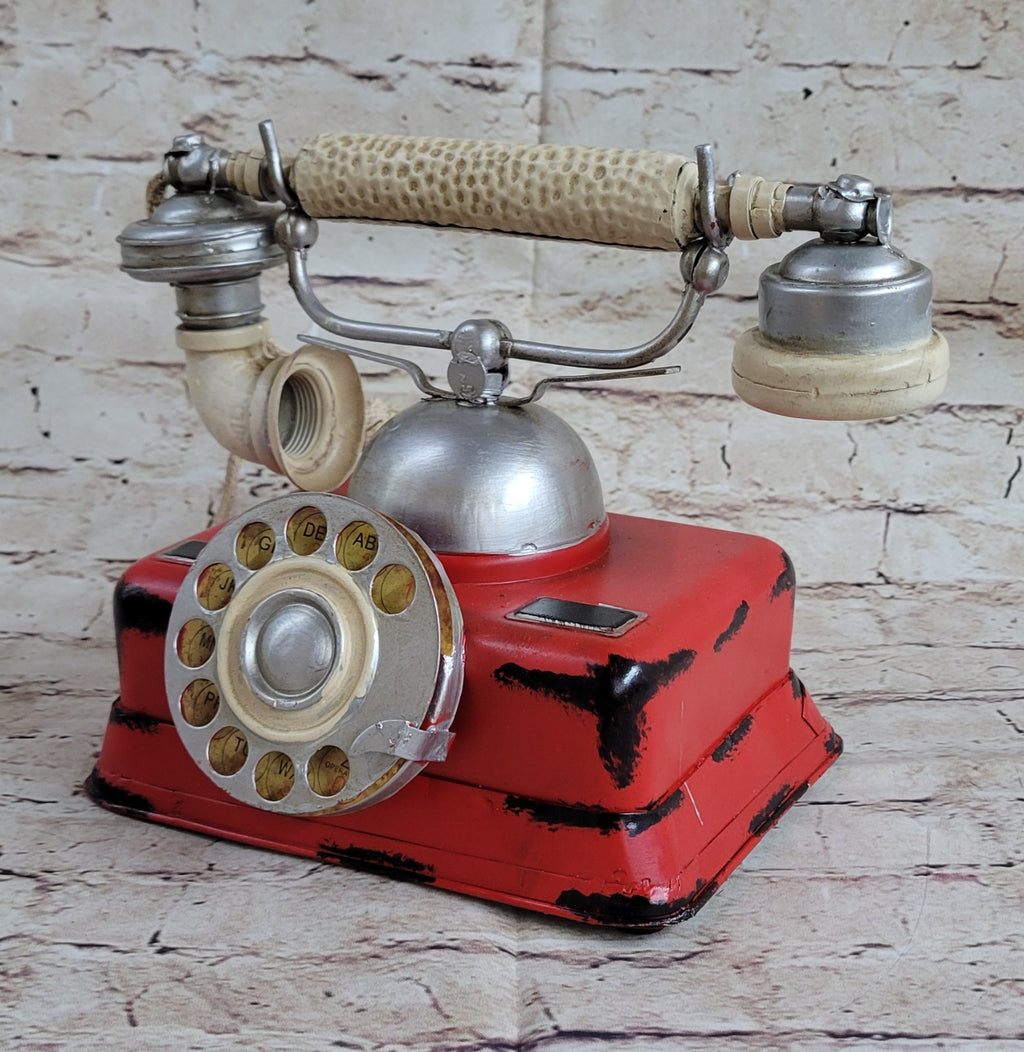 Decorate for any table, desk, or shelf in sporty fashion with Our Rustic Red German Rotary Dial Phone. Featuring a rustic iron frame, this charming vintage Classic Phone includes a fine detail's. The Red and Beige