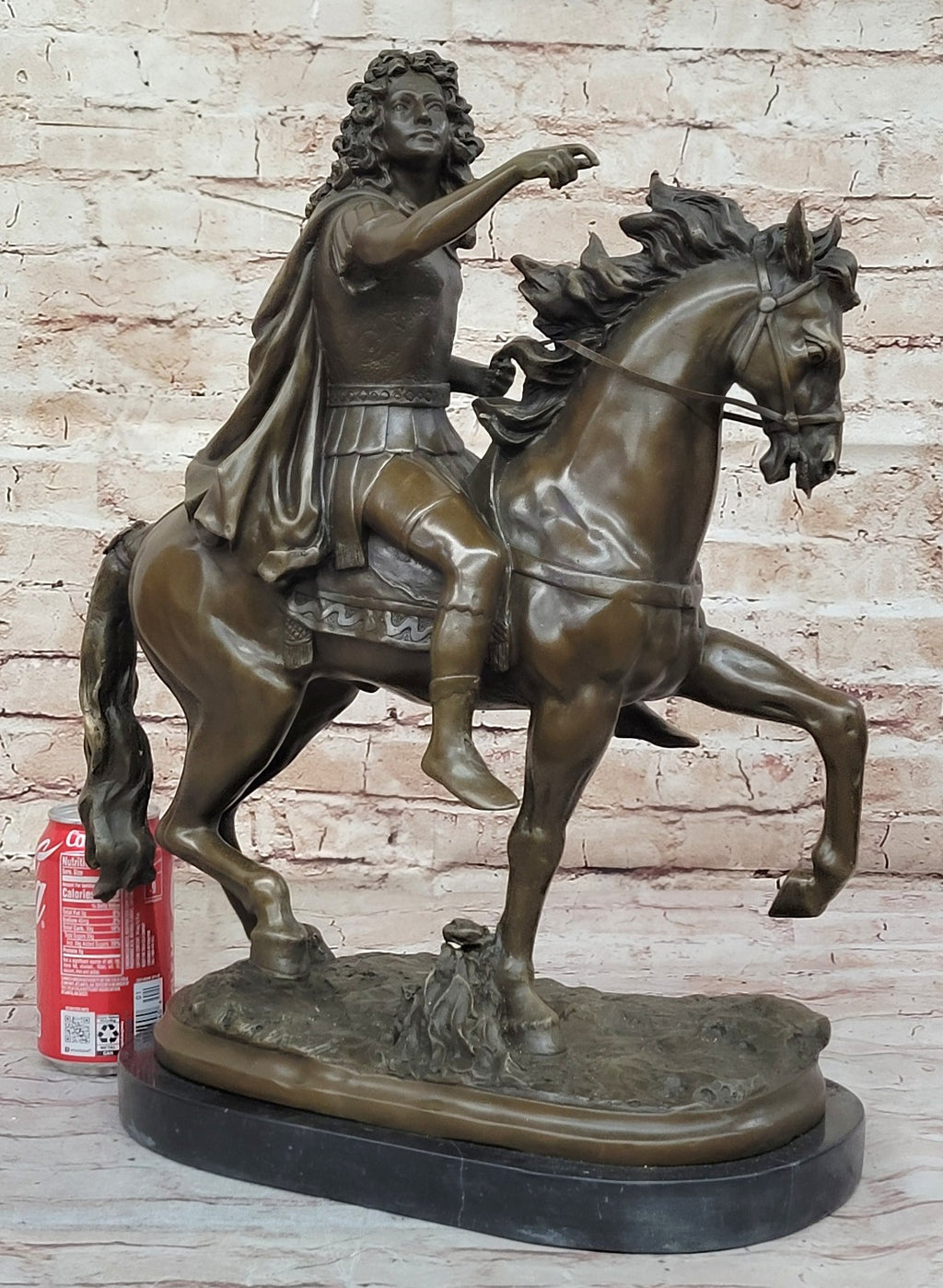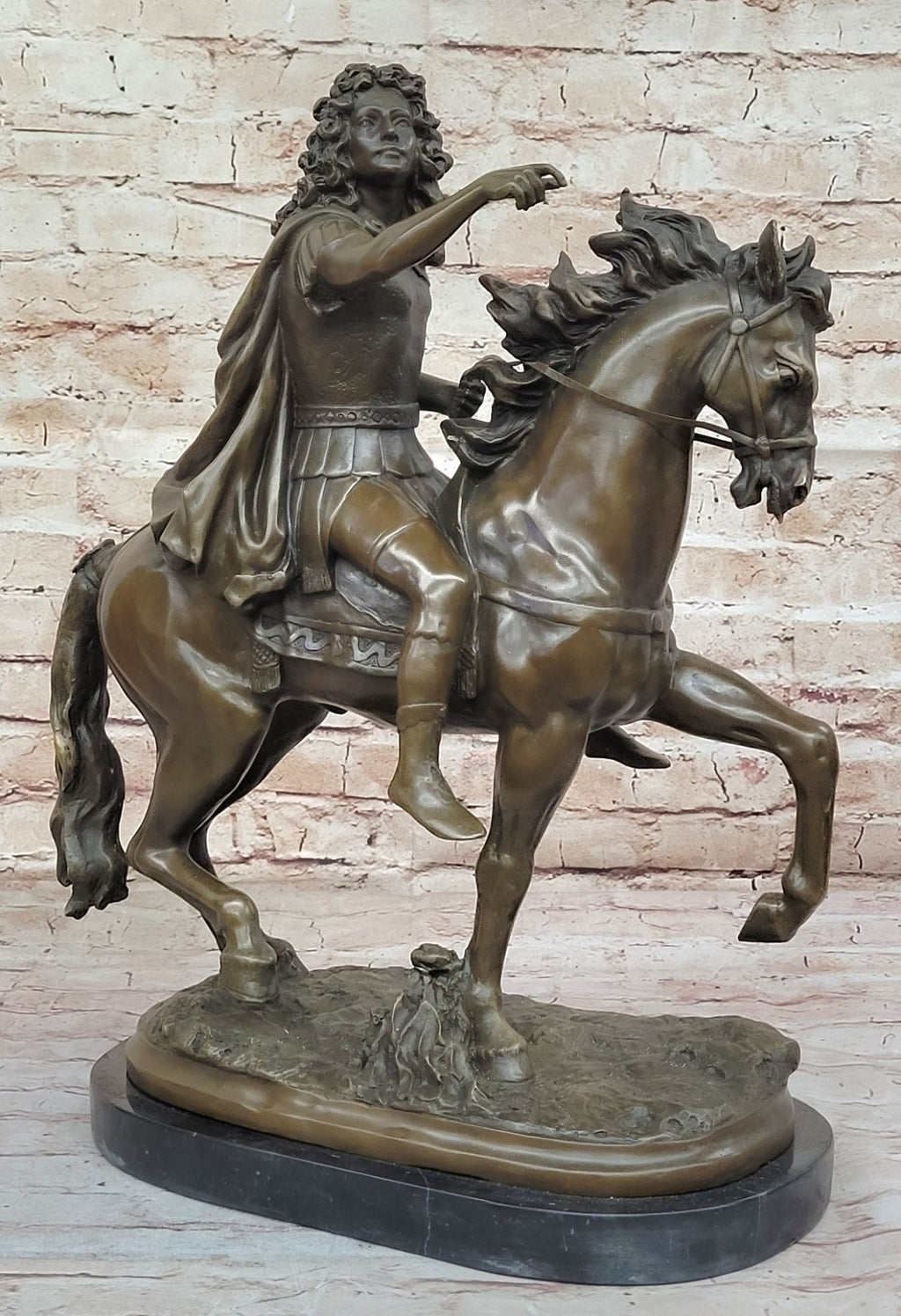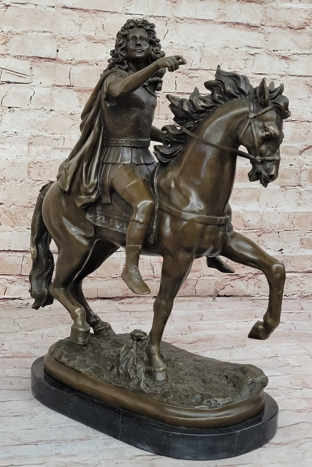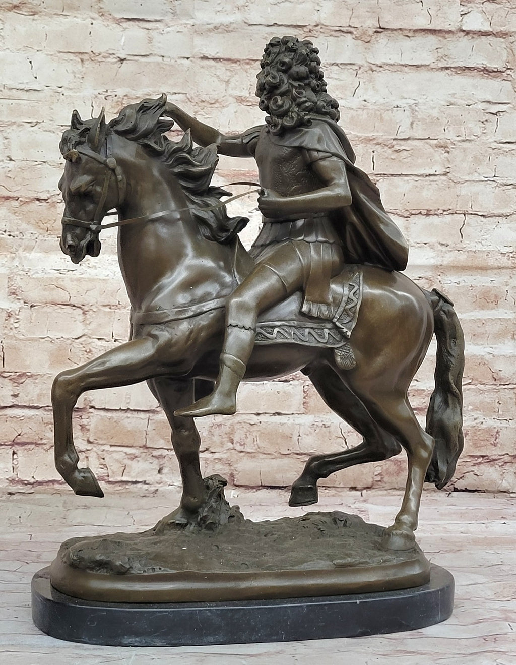 As a symbol of strength and leadership, this equestrian statue serves as a timeless addition to any space, whether displayed in a home, office, or gallery setting. Signed by the artist, it stands as a testament to Girardon's skill and artistry, inviting viewers to marvel at the beauty and significance of this historical figure.