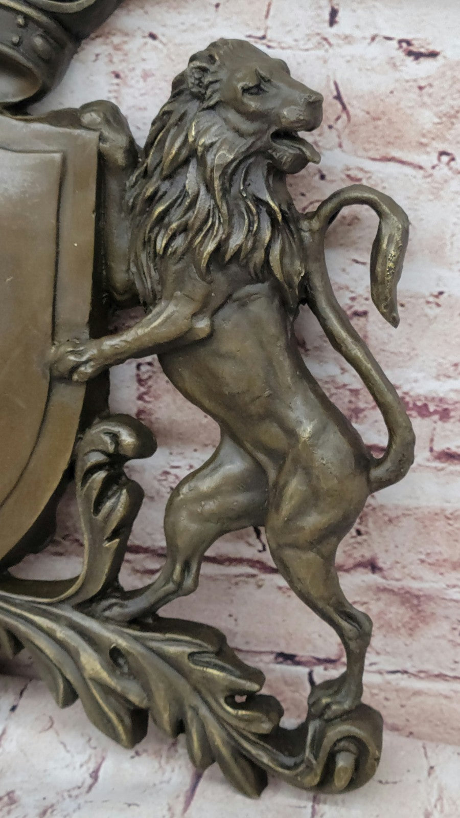 Adorning the shield is a majestic crown, a powerful emblem of authority and nobility. The intricate craftsmanship of the lions and the crown accentuates their regal nature, making this sculpture a striking symbol of power and protection. Created using the esteemed lost-wax casting technique, this handcrafted bronze piece captures the essence of the lions' strength and guardianship.
