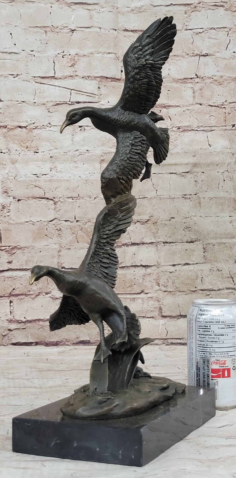 Handcrafted with meticulous detail and using the time-honored "Lost Wax Method," this bronze sculpture exhibits a rich brown patina finish that enhances its natural beauty. The ducks are rendered with lifelike precision, capturing their graceful forms and serene expressions. Mounted on a black marble base, the sculpture is not only elegant but also stable, making it a perfect centerpiece for any space. The piece proudly bears the signature of the renowned artist C. Fratin, further attesting to its quality and craftsmanship.
