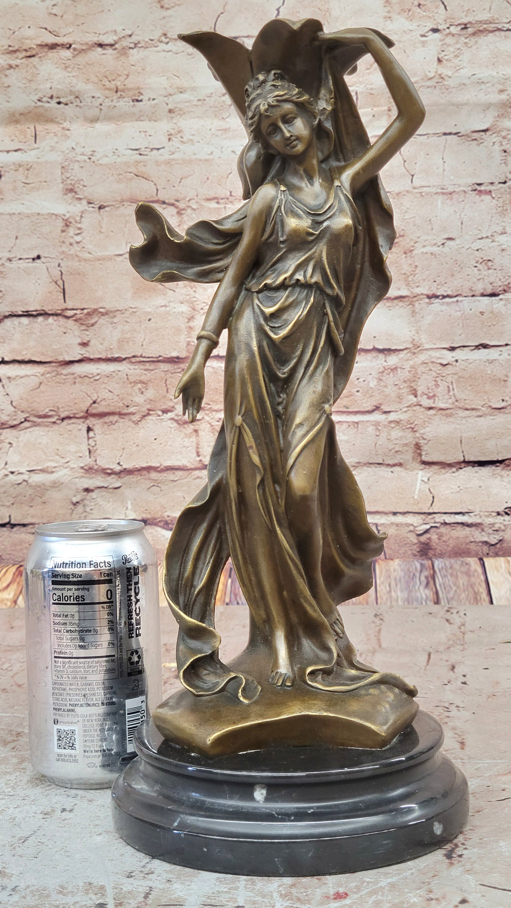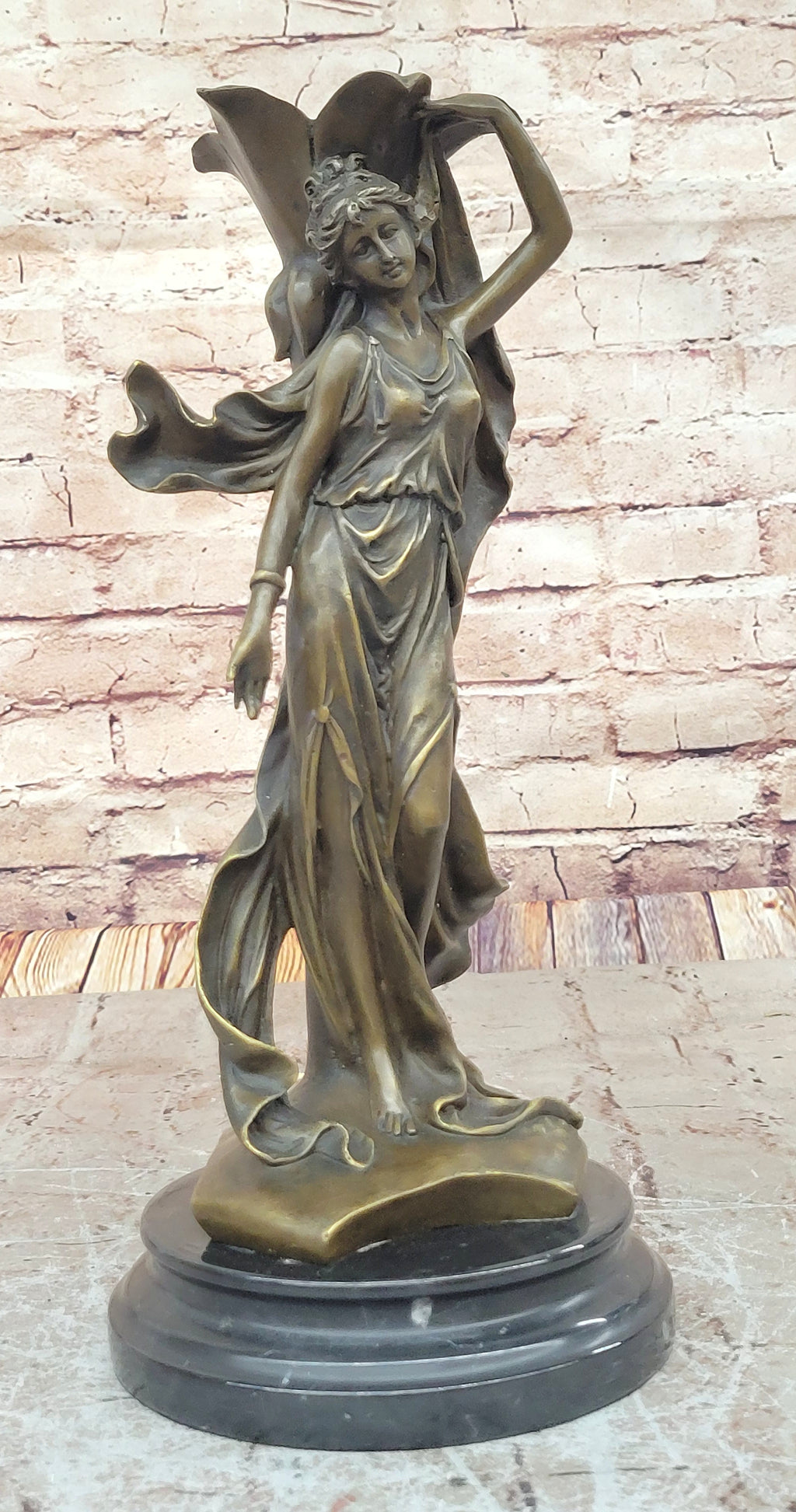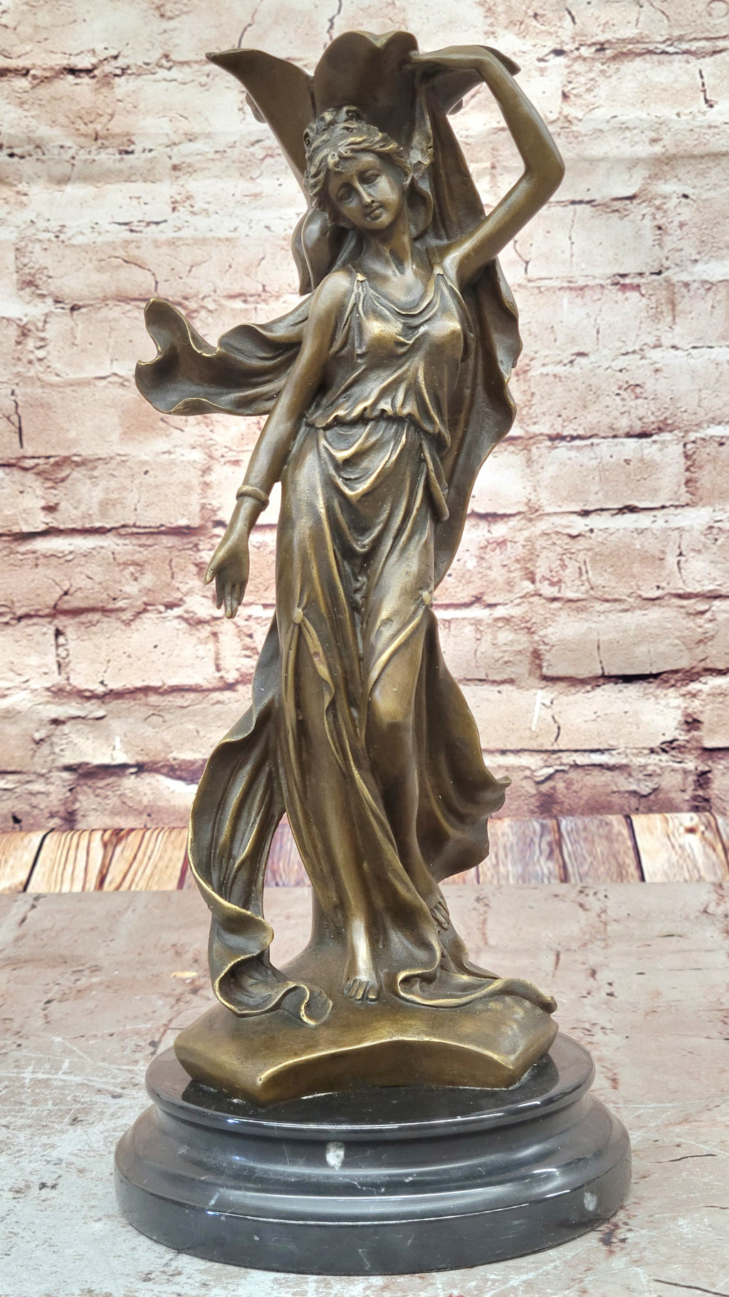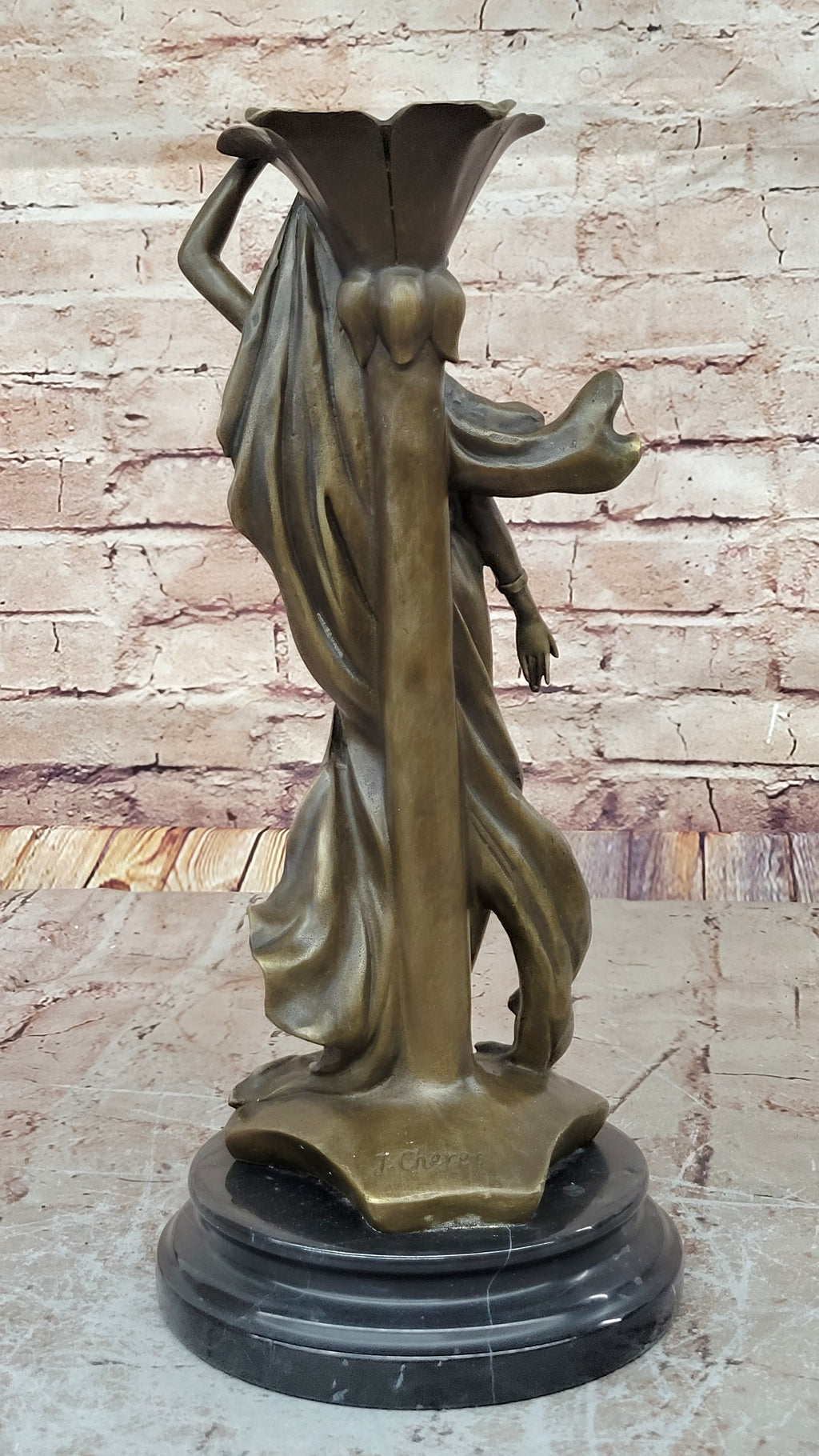 Finished with a warm brown patina, the statue exudes a sense of depth and richness, highlighting her elegant form and bringing life to the intricate details of her attire and stance. The patina also adds a timeless quality to the sculpture, making it an excellent addition to any Art Deco collection or refined space. Cheret's signature graces the piece, affirming its authenticity and craftsmanship.