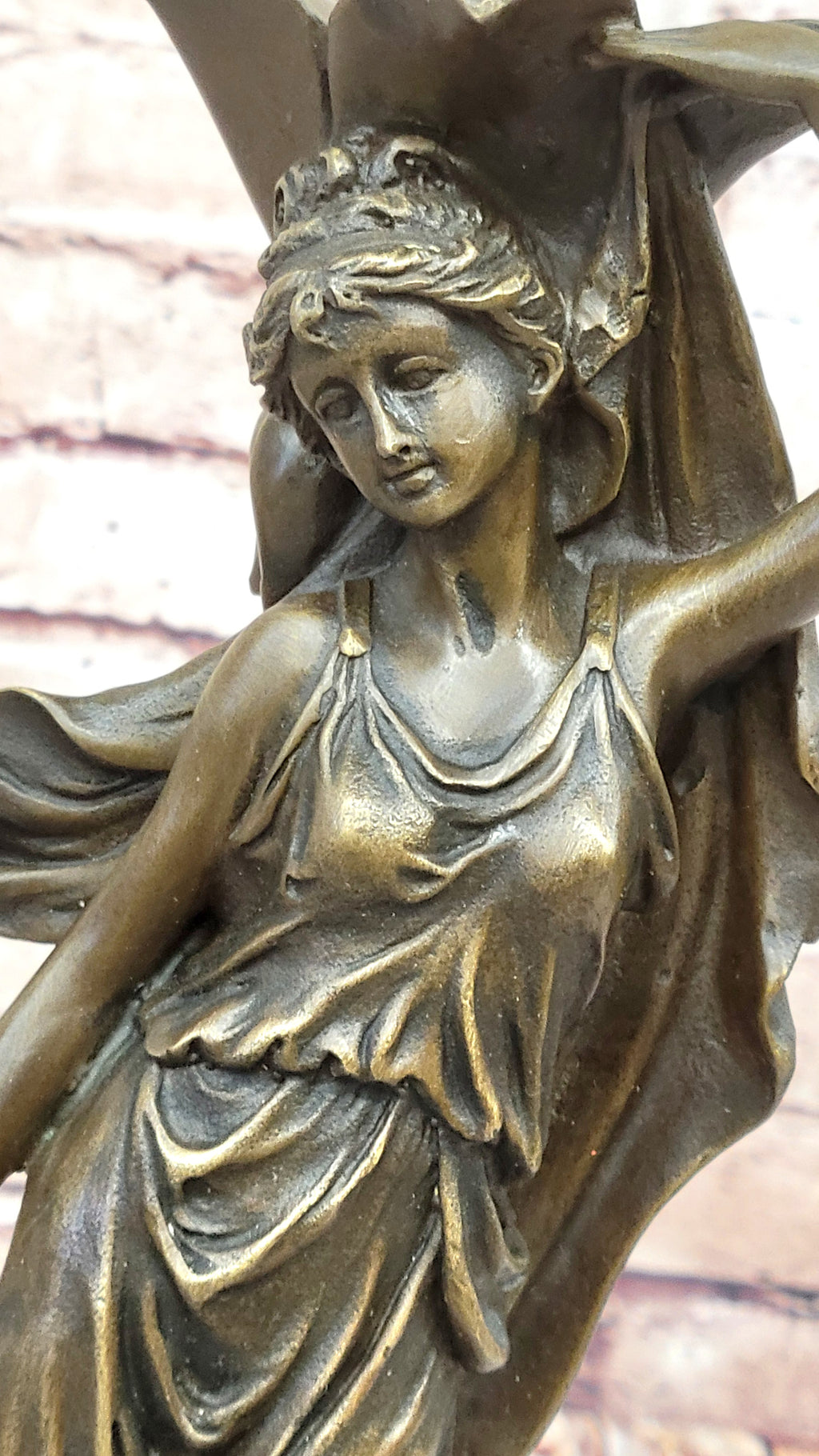 The statue is mounted on a sleek round black marble base that enhances its aesthetic appeal and offers a stable, elegant display. The combination of bronze and marble creates a sophisticated contrast, while the hot cast method used in its creation ensures durability and high-quality detail. This statue is not just a piece of art but a celebration of the refined yet daring spirit of Art Deco design.