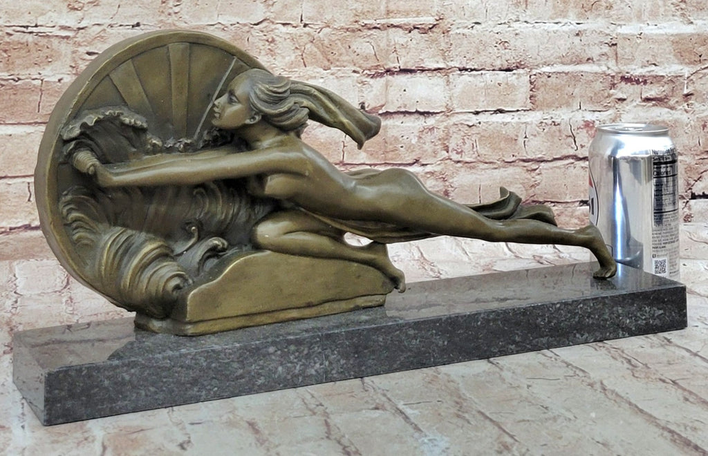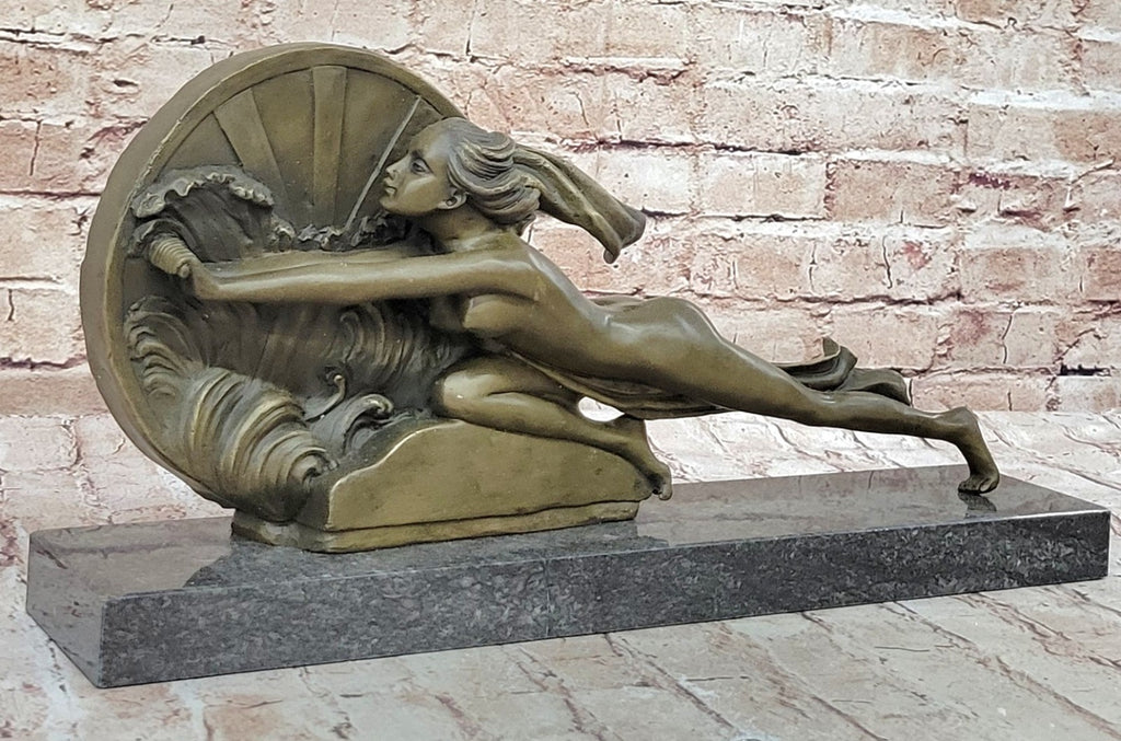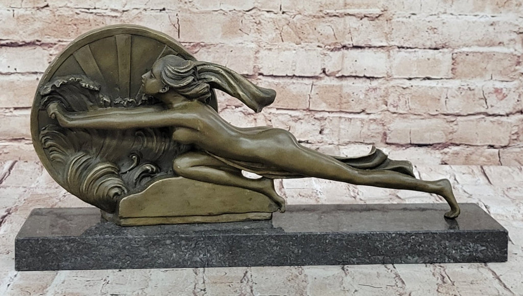 The sculpture's meticulously crafted features capture the essence of the subject's tranquil strength, accentuating the fluid movement of her long, lean body and the captivating flow of her billowing hair that soars behind her like a graceful wave. Crafted entirely by hand, this bronze sculpture boasts an exquisite brown patina finish, which was achieved using the revered "Lost Wax Method." The artist's dedication to detail is evident in every element, culminating in a masterful portrayal of feminine strength and poise.