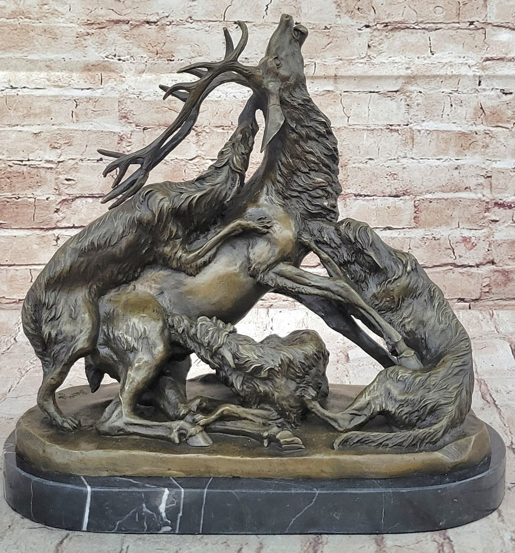 Bring the raw intensity of the wilderness into your space with this Signed Barye Bronze Sculpture, depicting a heroic elk defending itself against a pack of wild dogs. This dynamic scene captures the tense struggle for survival, with the elk’s head lowered and antlers poised as a formidable shield against the attacking pack. Every angle reveals a meticulous attention to detail, conveying motion, strength, and the untamed spirit of nature.