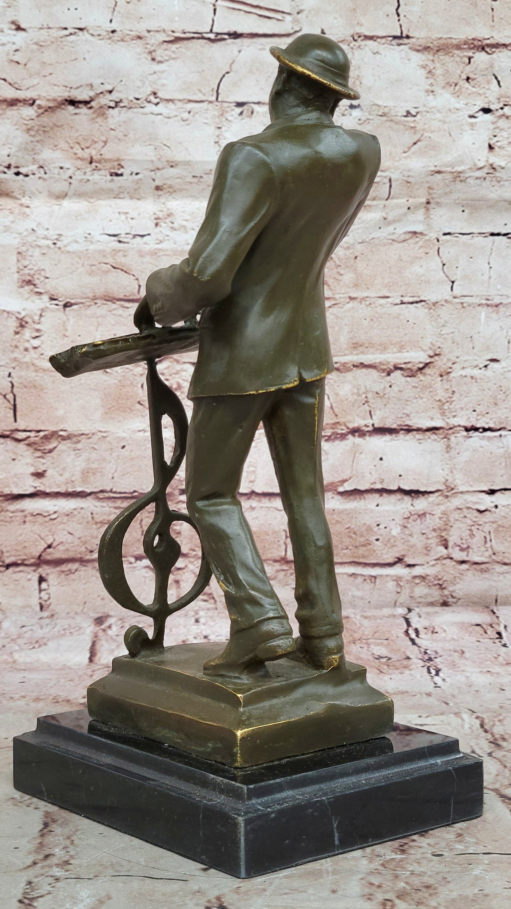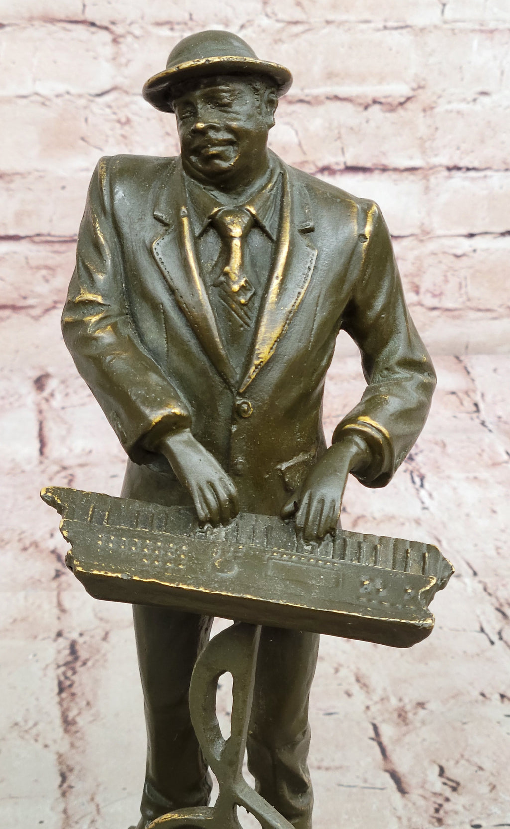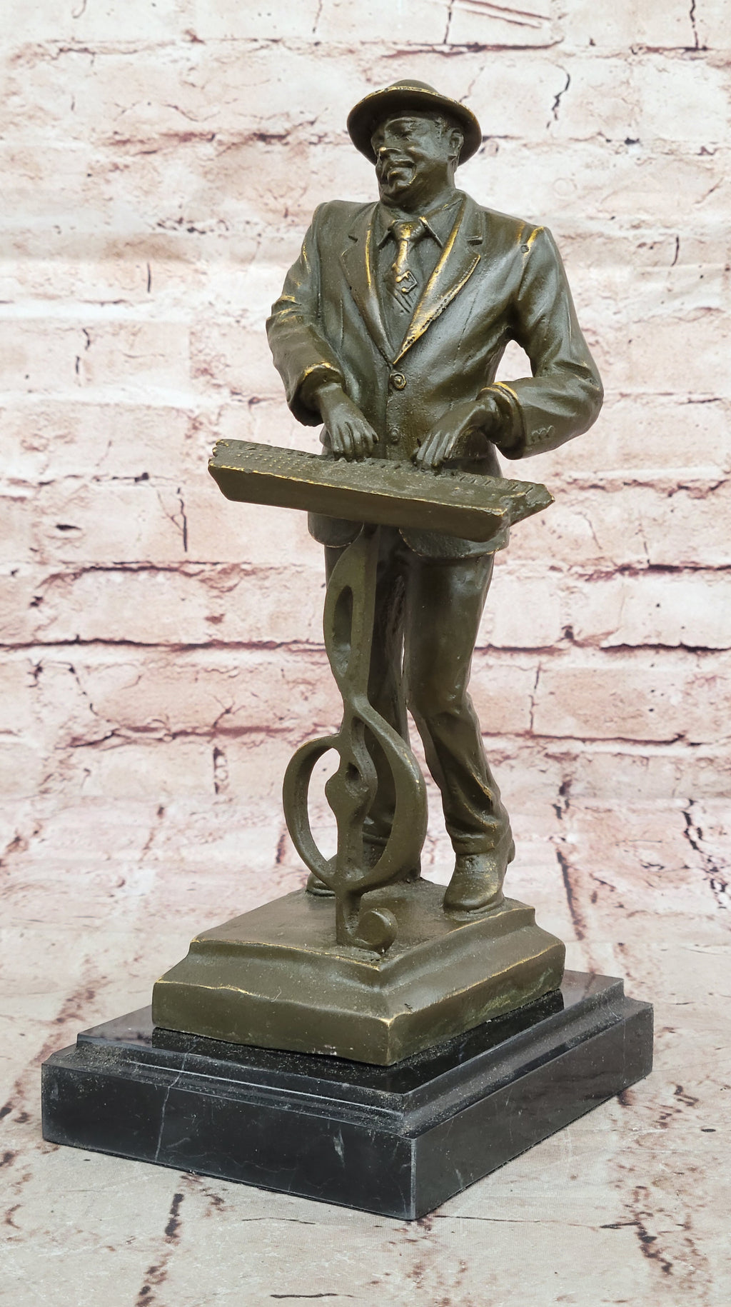 Handmade using the lost wax method, the statue is rich in detail and texture, showcasing the folds of his clothing, the lines of the keyboard, and the subtle features of his face. The brown patina finish adds warmth and character to the work, enhancing its lifelike presence while honoring the timeless appeal of bronze as a medium.