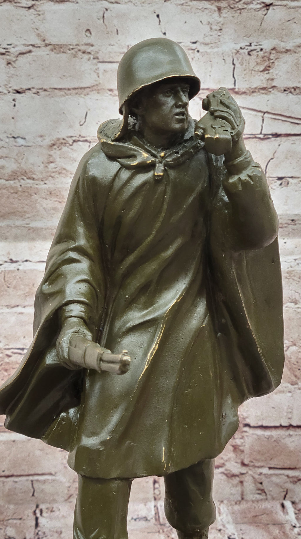 The sculpture is finished with a dark brown patina, which highlights the fine details of the soldier's uniform, weapon, and facial expression. The depth and texture of the patina give the figure a timeless, commanding presence, emphasizing the stoic nature of a soldier ready for duty. Every detail, from the folds of his clothing to the grip on his rifle, is meticulously crafted, making this a highly detailed and realistic representation.