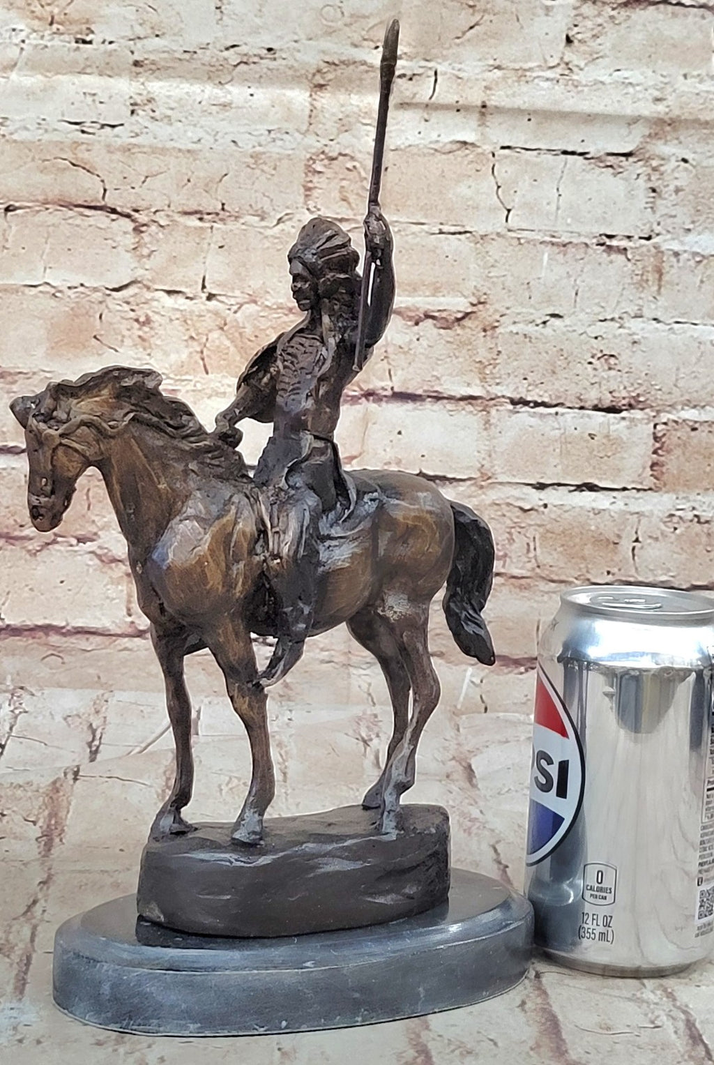 This bronze masterpiece beautifully captures the essence of the Native American chief's heritage, with intricate details such as his traditional feathered hat helmet and braided adornment, symbolizing his deep connection to his cultural roots. Draped in a cloth skirt, he maintains his modesty while proudly displaying his cultural attire. The sculpture extends its focus to the chief's noble steed, a magnificent stallion bedecked in full tack, symbolizing the profound bond between man and beast.