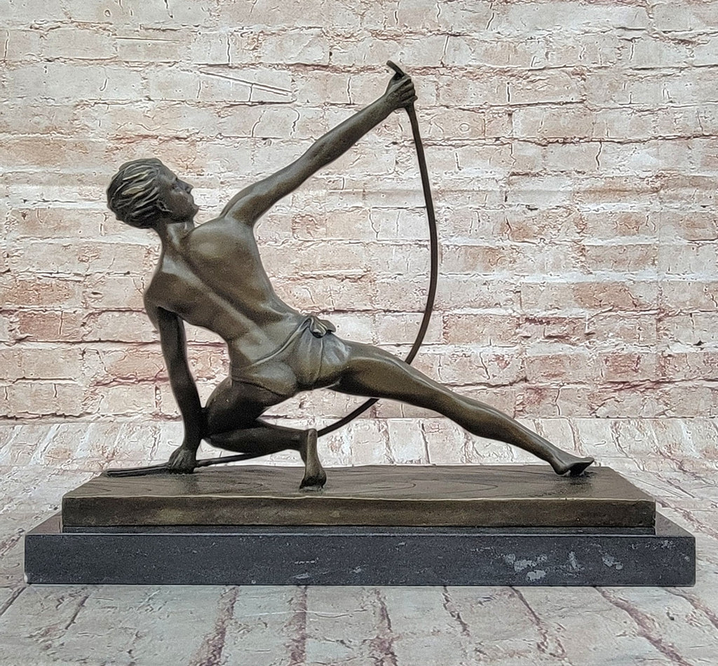 Crafted with meticulous attention to detail, the sculpture highlights the artist's skillful portrayal of the human form. Each carefully constructed muscle in the figure's arms, chest, stomach, and legs is intricately delineated, emphasizing the sculptor's dedication to capturing the intricacies of the human anatomy. The precise detailing extends to the portrayal of the figure's facial features, revealing his clenched jaw and defined cheekbones, imparting a sense of intensity and unwavering resolve.