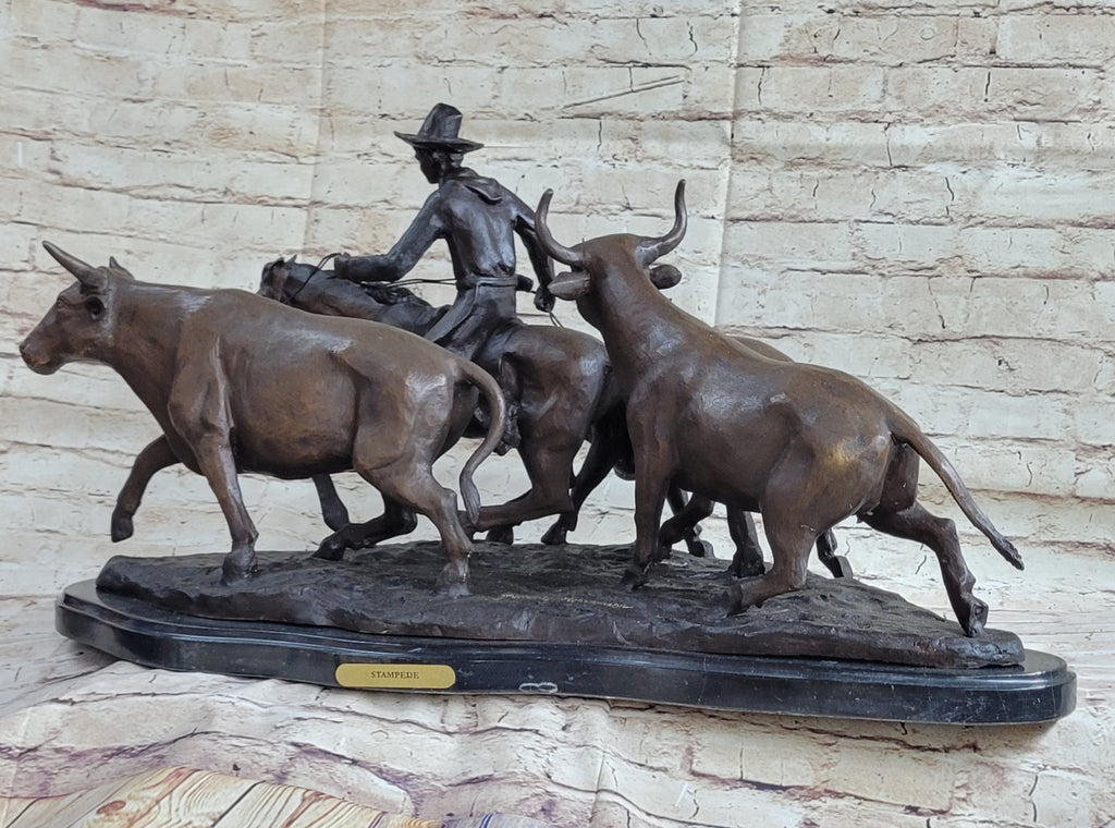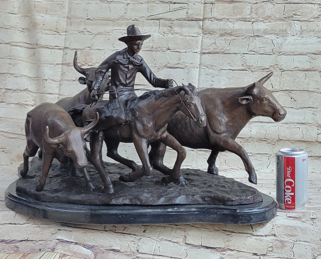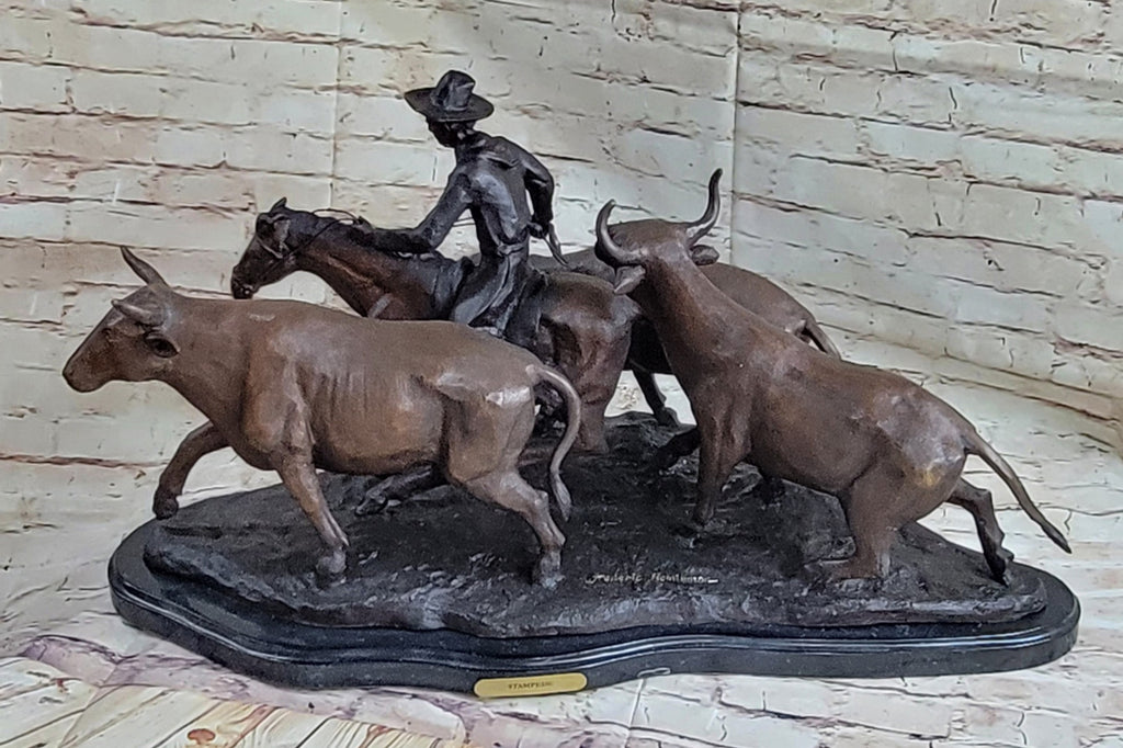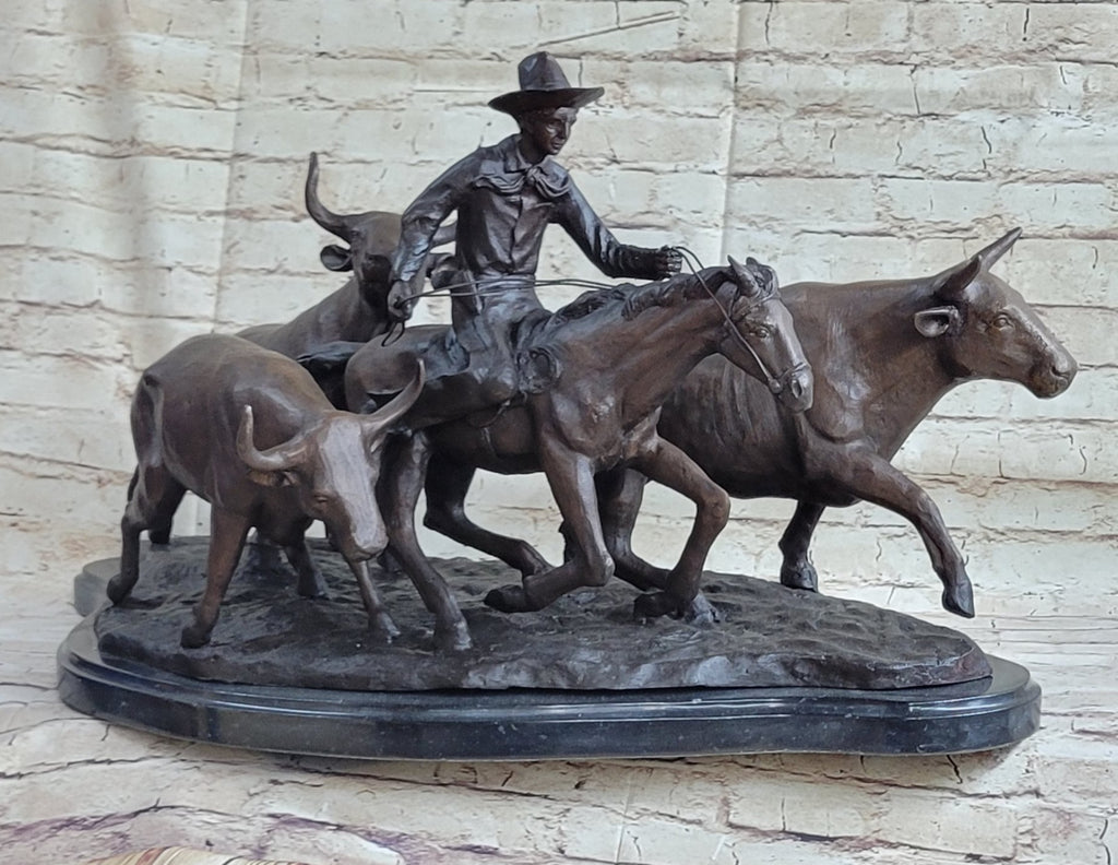Experience the enduring legacy of Frederic Remington and the captivating spirit of the Wild West with this remarkable bronze sculpture. Capturing the essence of a lone cowboy on an arduous journey, the sculpture depicts the cowboy's unwavering determination as he guides a herd of bulls through challenging terrain. Remington's deep understanding of the equestrian world and his meticulous attention to detail shine through in this piece, reflecting his lifelong commitment to capturing the vibrant spirit and rugged beauty of the American frontier. Crafted using the revered Lost Wax Method, this sculpture is a testament to Remington's artistic vision and his ability to infuse each piece with a sense of authenticity and timeless appeal. Signed by the artist himself, this sculpture stands as a fitting tribute to Remington's enduring impact on the world of art and his lasting contribution to the rich tapestry of American history and culture.