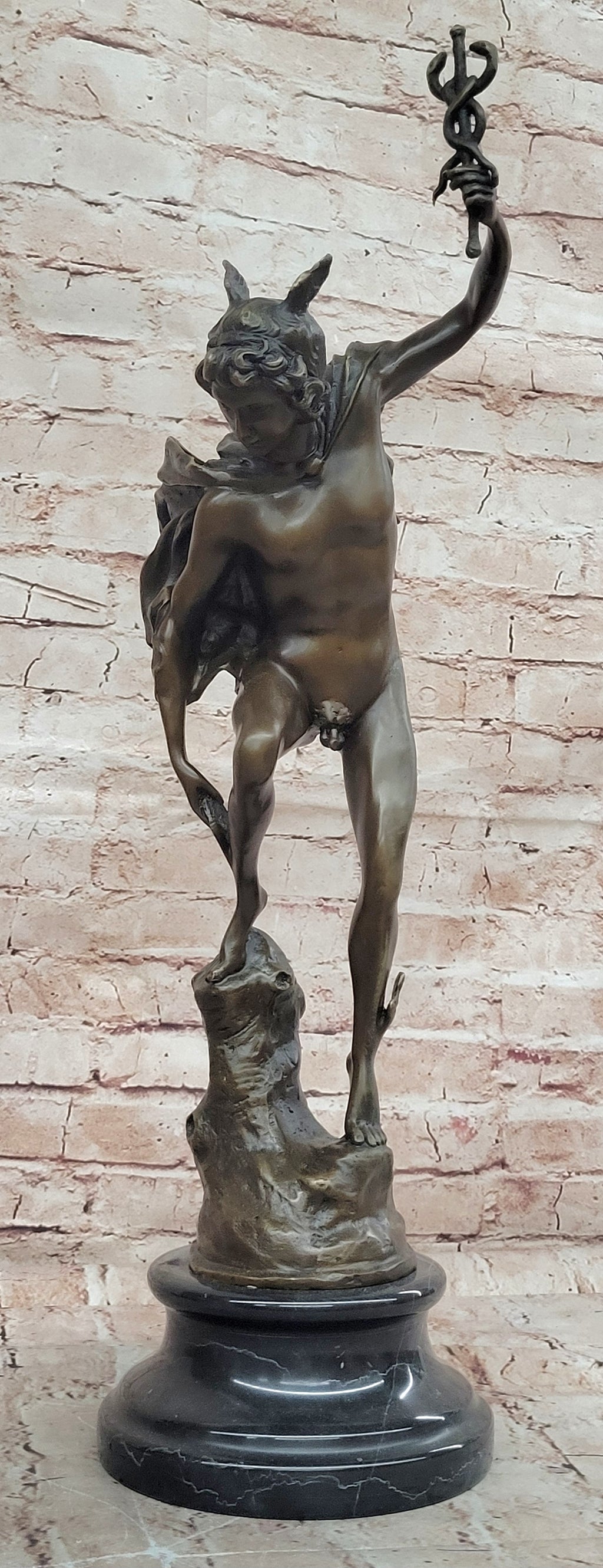 Crafted with meticulous detail using the "Lost Wax Method", this sculpture brings Mercury to life, showcasing the fluidity of his form and the intricacies of his attire. The dynamic posture, combined with the luxurious heavy marble base adorned with bronze trim, elevates the piece to a level of timeless elegance. The artist's signature, Giambologna, not only affirms the sculpture's authenticity but also connects it to the rich legacy of Renaissance artistry.