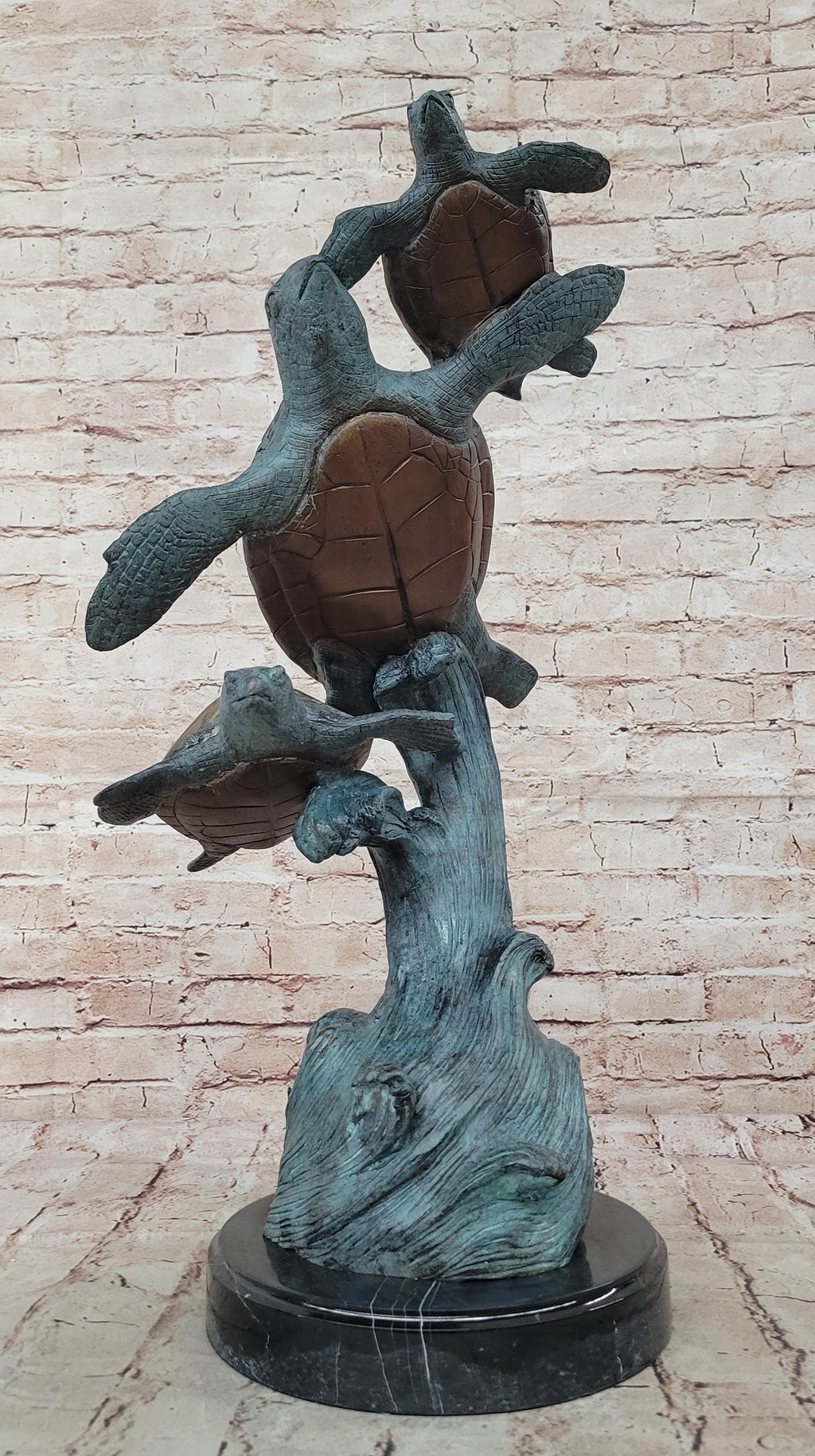 A striking feature of this sculpture is the use of a beautiful bronze turquoise colored patina, which covers the base and creates the illusion of water flowing upward. This artistic representation of a current adds depth and realism to the piece, evoking a sense of life, progress, and exploration. The combination of the two-toned patina with green accents further enhances the overall aesthetic appeal of the artwork.