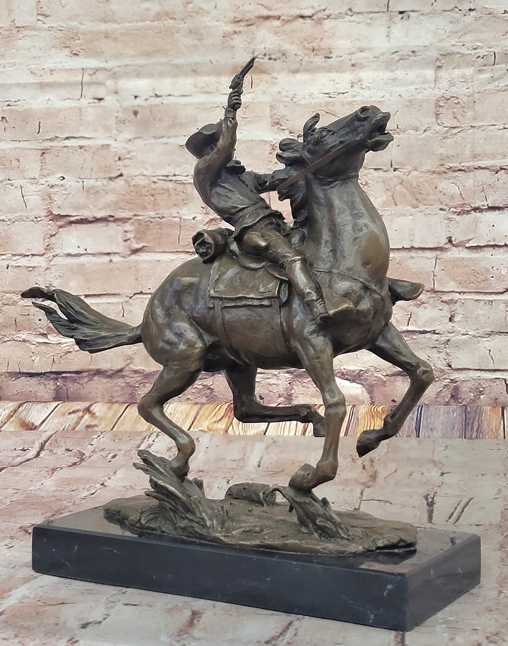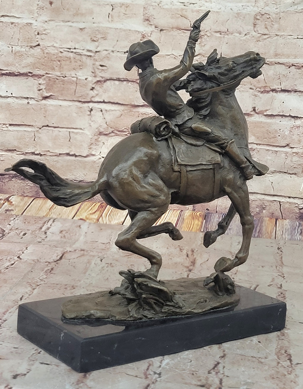 Handcrafted using the age-old "Lost Wax Method," this sculpture is a tribute to the artistry of Frederic Remington, the renowned artist known for his depictions of the Wild West. The sculpture's brown patina finish enhances the textures and details, giving it a timeless and rustic charm. Mounted on a black marble base, this artwork stands as a testament to the enduring legacy of the cowboy and the untamed spirit of the American West. It is signed by the artist Remington, further adding to its quality and value. Display "A Cowboy's Charge" in your space to capture the essence of adventure, courage, and the spirit of the open frontier.
