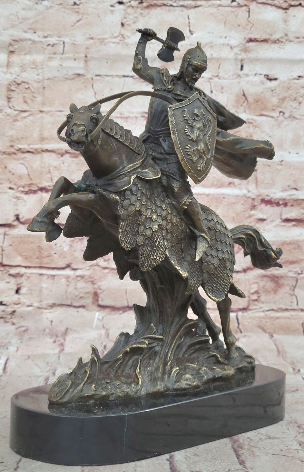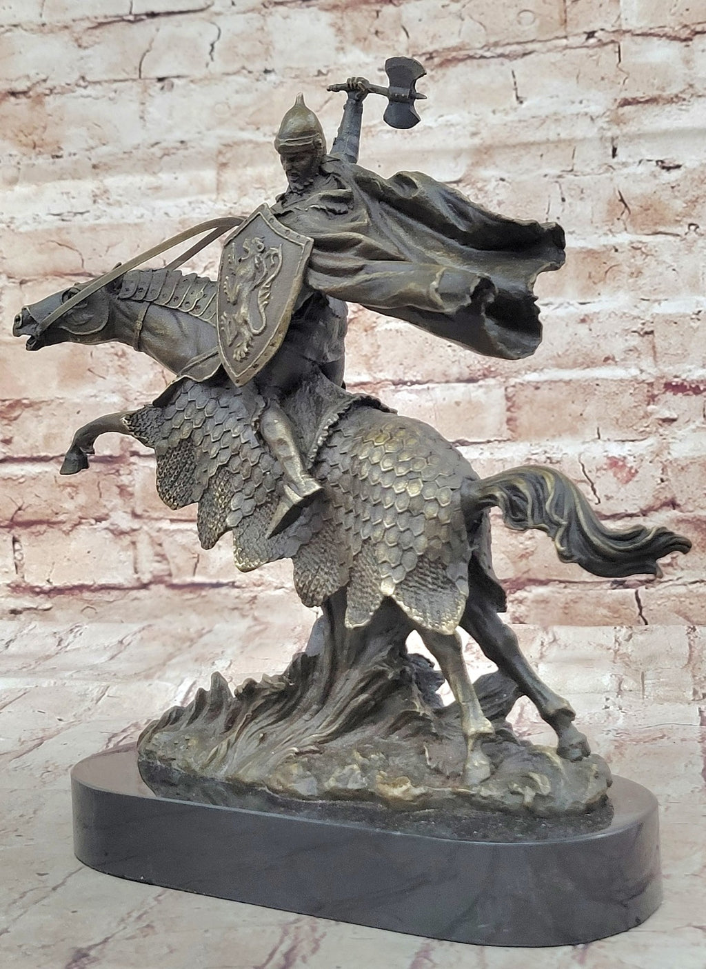 Crafted with exceptional skill using the lost-wax method of casting, this sculpture faithfully reproduces every intricate detail of the Viking and his steed. The rich brown patina finish enhances the visual depth, bringing out the fine details of the Viking's armor, the texture of the horse's mane, and the overall dynamic energy of the scene. The statue is securely mounted on a solid black marble base, which not only adds to its stability but also elevates its aesthetic appeal, making it a striking centerpiece.