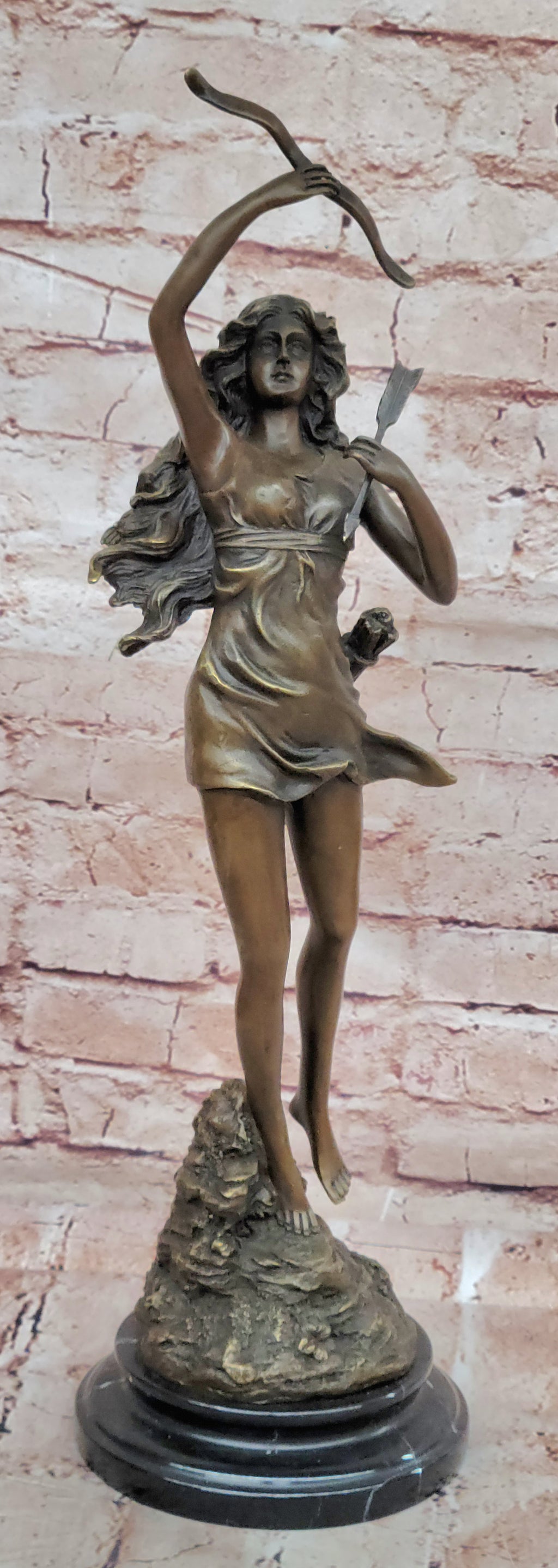 Bring timeless elegance and mythic beauty to your space with the Vintage Bronze Art Deco Nude Goddess Diana the Huntress Fountain Garden Statue by renowned sculptor C. Mirval. This breathtaking bronze masterpiece captures the playful spirit of Diana, the Goddess of the Hunt, as she steals Cupid’s bow in a moment of whimsy and grace.