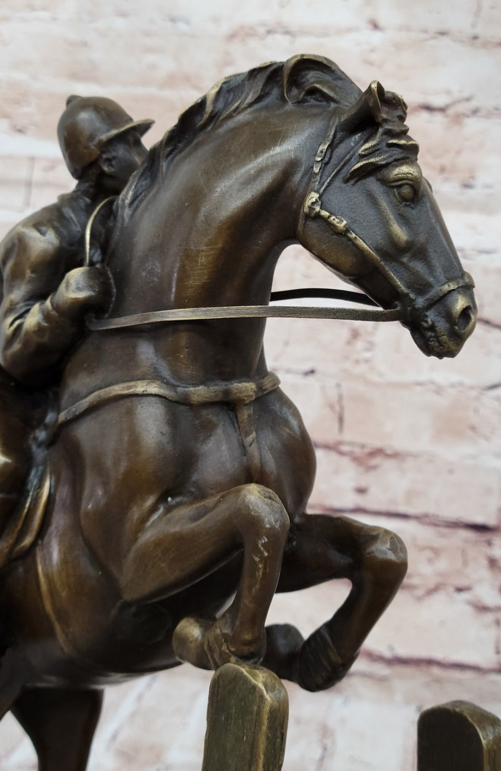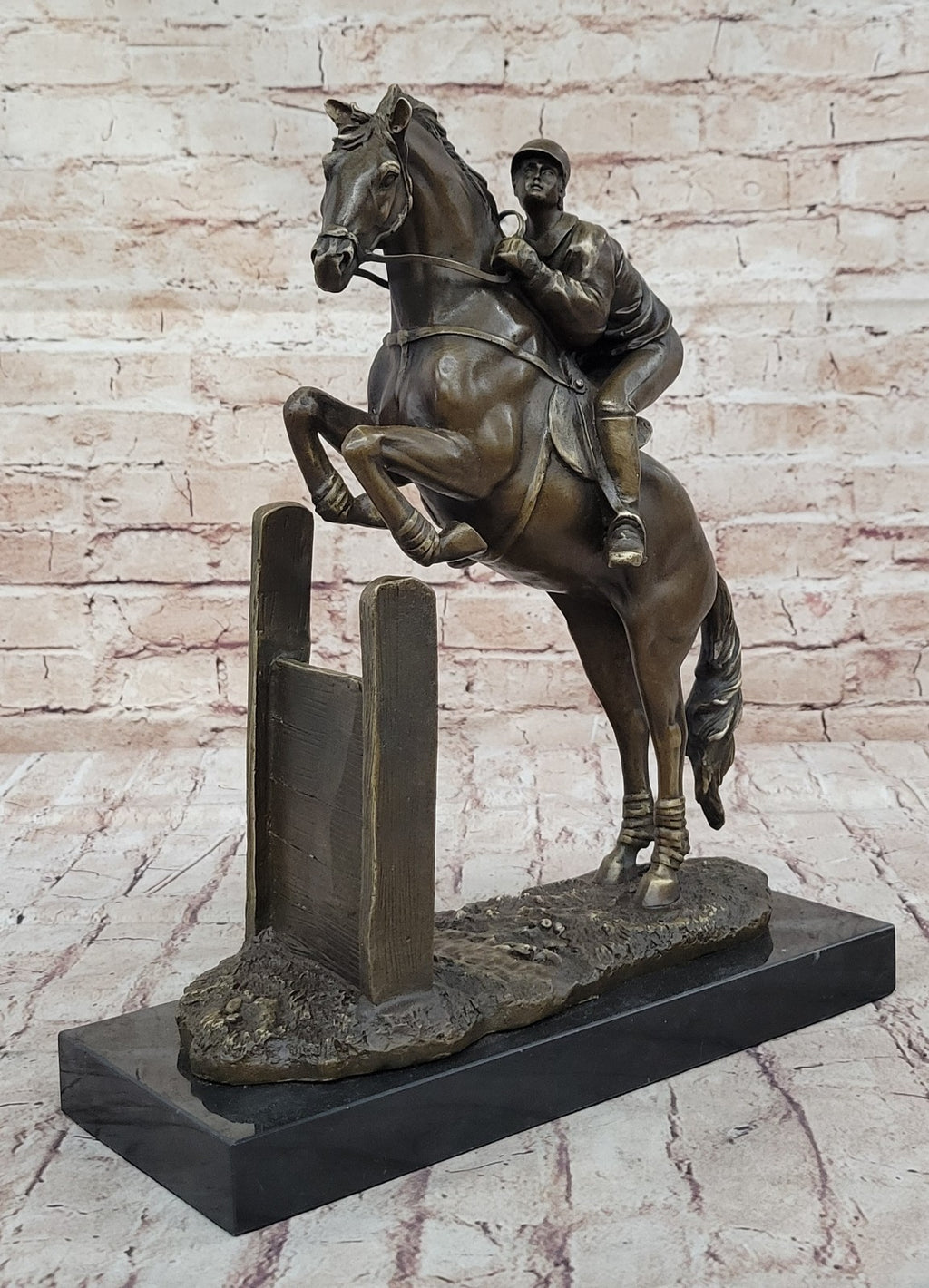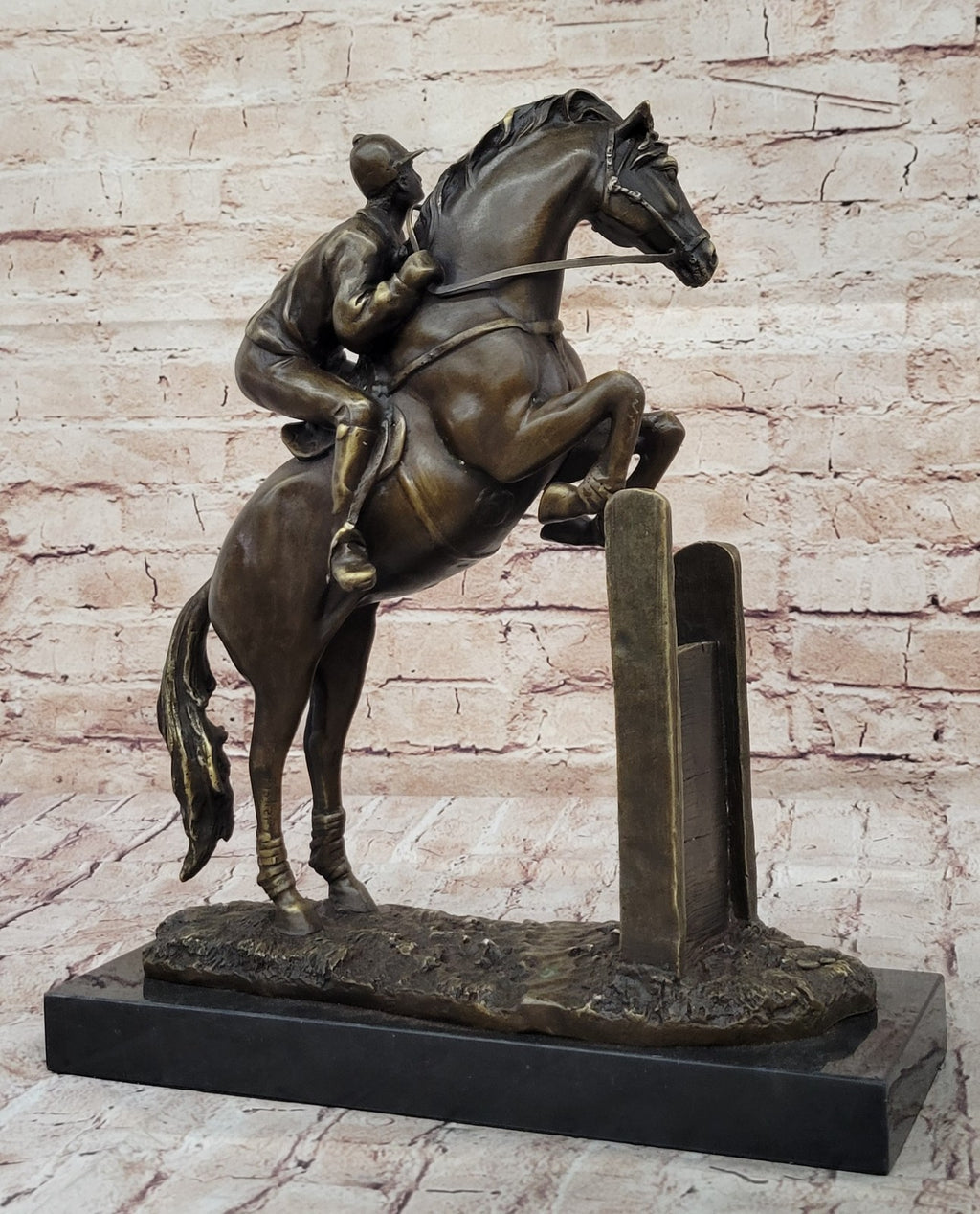 Crafted with meticulous attention to detail, this action-packed bronze sculpture captures the essence of the thrilling sport of horse racing, evoking a sense of excitement and anticipation for the fast-paced world of equestrian competition. The intricate nuances of the horse's musculature and the jockey's determined expression add depth and character to the sculpture, highlighting the artist's skill and dedication to capturing the dynamic energy of the race. With its brown patina finish, the sculpture exudes a timeless elegance and sophistication, serving as a striking centerpiece that commands attention and admiration. Perfect for avid horse racing enthusiasts or individuals with a passion for determination and drive, this sculpture serves as an enduring symbol of perseverance and the relentless pursuit of victory, making it a truly remarkable and inspiring gift for any occasion.