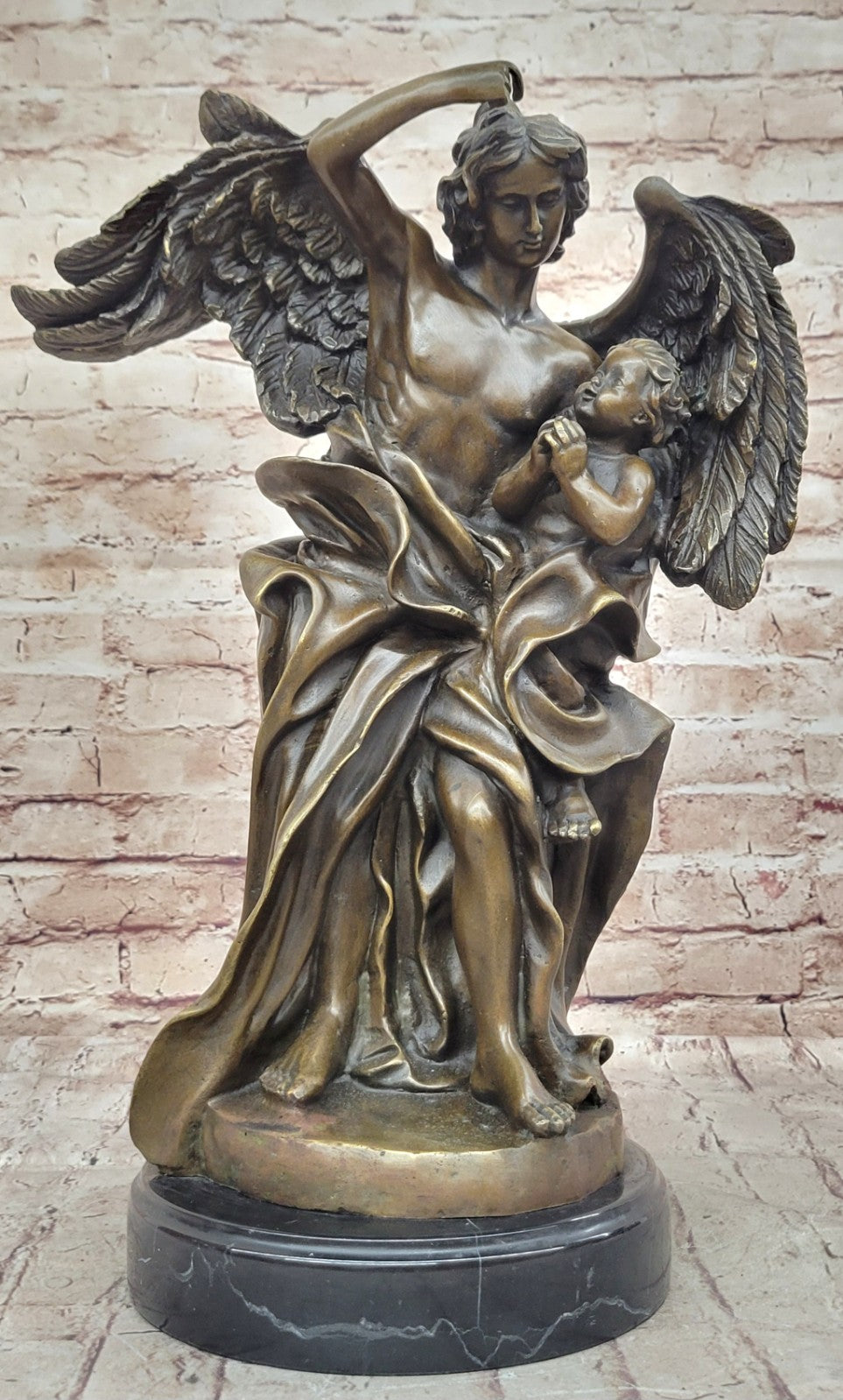 A muscular angel holds a beautiful, healthy baby with tender care in this stunning bronze sculpture. The angel's raised finger gently touches the precious baby, embodying a moment of pure affection and guardianship. His majestic wings, spread wide in a W shape, are detailed with thick feathers, evoking the grace and strength of a bird in flight.