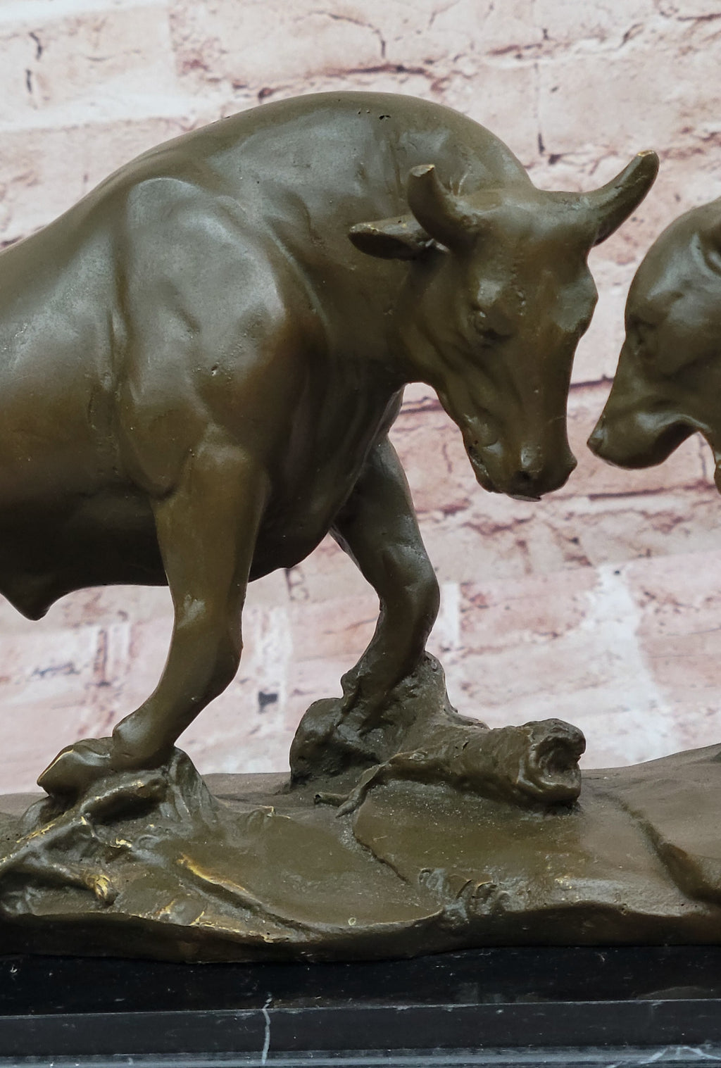 Handmade using the lost wax method, this 100% bronze sculpture features a rich brown patina, adding depth and texture to the detailed musculature and movement of both animals. It is signed and numbered, making it a collector’s edition, ideal for investors, financial professionals, and art enthusiasts alike.