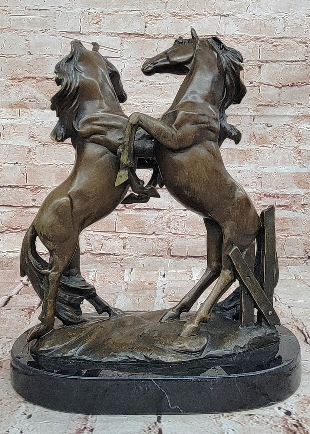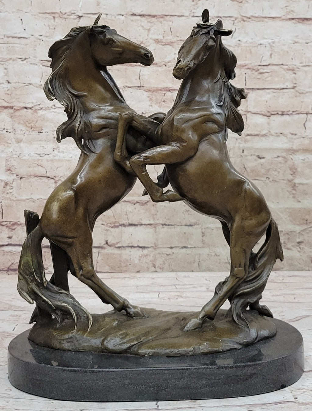 With its bronze construction and brown patina finish, this sculpture exudes timeless elegance and sophistication, making it an exquisite addition to any home, office, or outdoor space. Mounted on a bronze plinth, it commands attention as a striking centerpiece or focal point, inviting viewers to appreciate the beauty and symbolism of the horse's form. Beyond its aesthetic appeal, the sculpture serves as a tribute to the horse's significant role in human civilization, reflecting its contributions to warfare, agriculture, and transportation.