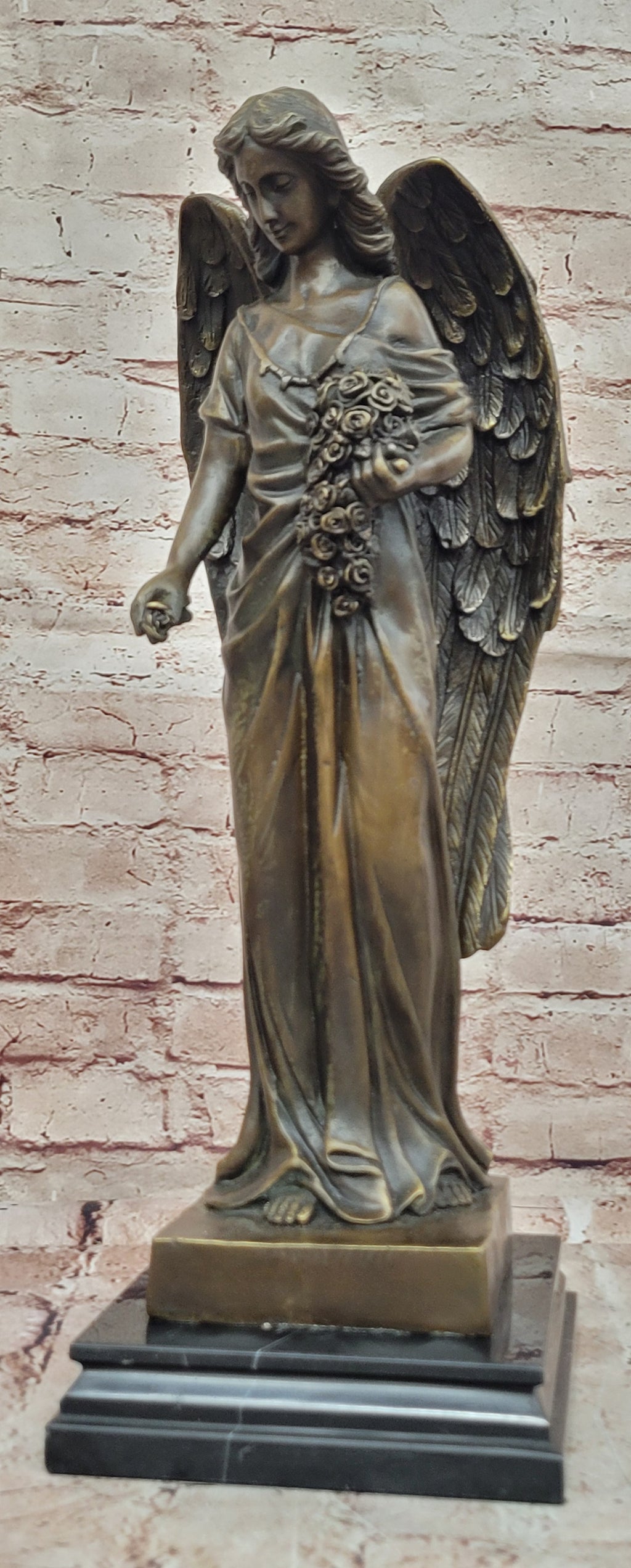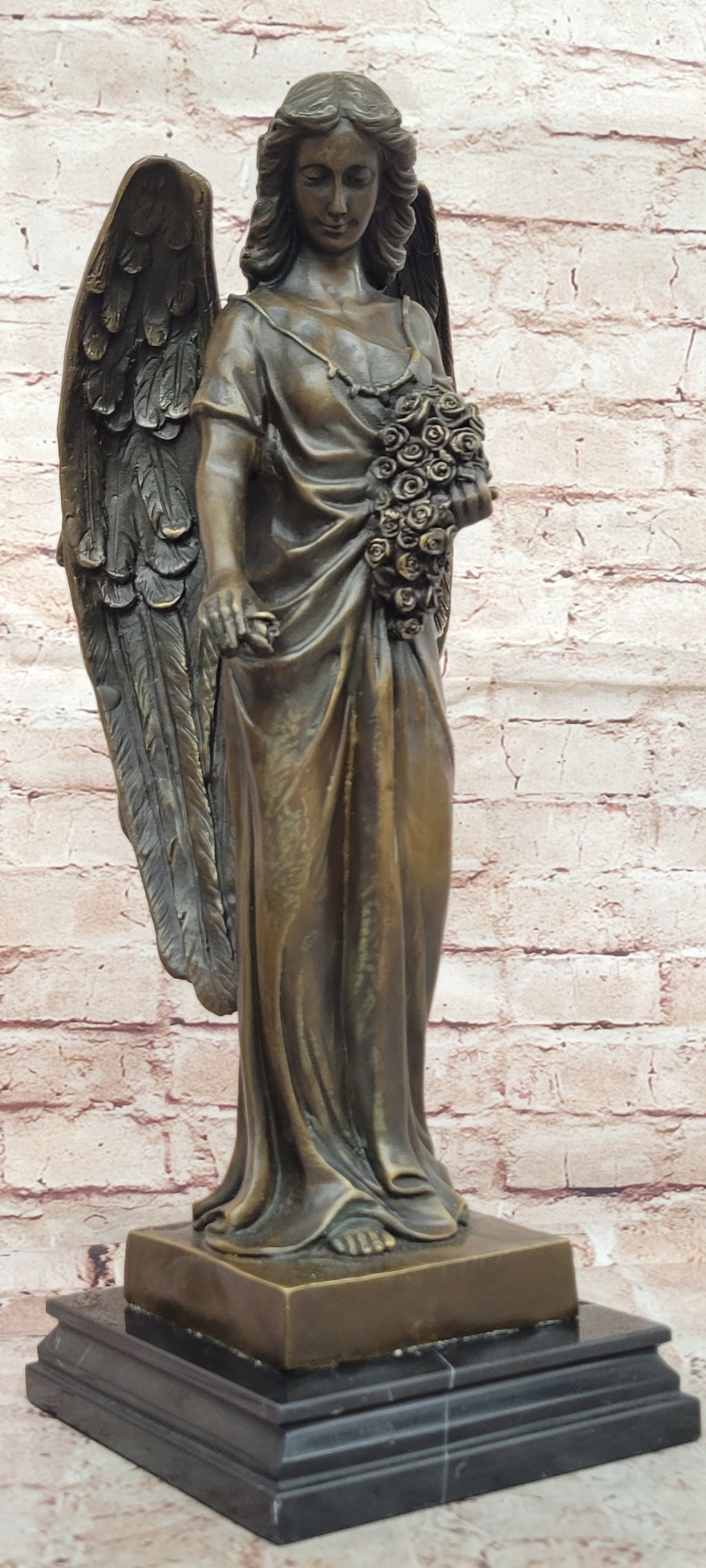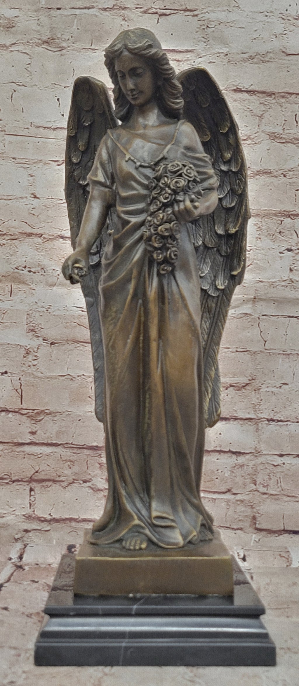 Elevate your space with this Young Angel Bronze Statue with Flower Bouquet. Handcrafted in Spain using the Lost Wax Method, this solid bronze sculpture captures the angel’s grace, delicate features, and flowing details. Finished with a rich patina and mounted on a sturdy base, it is suitable for indoor or outdoor display, serving as a timeless decorative piece or memorial artwork, celebrating beauty, serenity, and craftsmanship.